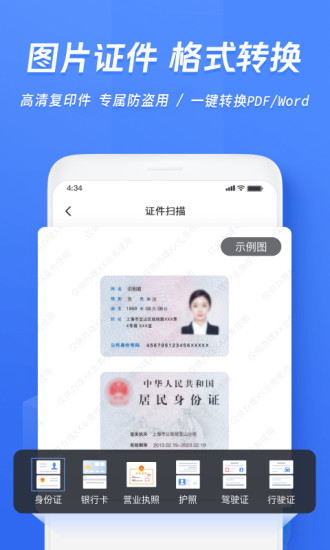 全能扫描软件,支持图片转PDF转文字、扫描转表格、扫描翻译识别、文字提取、证件文件扫描等多用途的ocr扫描工具 全能扫描王免费版,免费的手机扫描仪,图片高清处理,文档格式转换,文字识别工具,文档管理工具。使用手机就可以实现图片扫描、文字识别、扫描翻译、文档扫描、证件扫描等强大功能 ---功能亮点---- 【拍照扫描】 * 手机拍文档,自动去除杂乱背景,生成高清PDF、JPG文件 * 用手机可将纸质文件,快速转为清晰的电子文档 【文本识别】 * 扫描各种文件、图片、书籍等提取想要的文字 * 强大的OCR文字识别技术支持:中文、英语、日语、法语、德语、俄语、葡萄牙语、西班牙语、意大利语等16种语言文字识别 【智能证件识别】 * OCR文字识别技术自动识别、提取图片文字 ,智能解析证件信息 * 支持多种证件类型:身份证,银行卡,驾驶证,名片,营业执照,护照,电子运单,户口本,港澳通行证 【表格扫描识别】 * 智能识别表格文档,识别结果保存为 Excel格式,快速完成纸质报表单据的自动录入