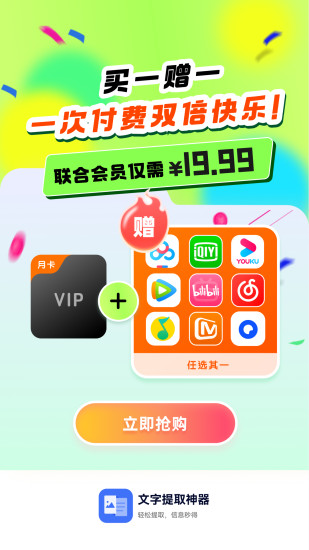 【限时福利】开通文字提取申请会员买1送1!额外加赠热门平台会员:芒果TV/腾讯视频/B站(三选一),超值双重权益即刻拥有! 文字提取神器是一款一款OCR拍照识别软件,使用手机就可以实现文字识别、手写识别、拍照翻译、批量扫描识别、手写识别等功能,识别后的文字可以进行在线编辑调整、翻译,并且可以导出为word、txt等多种格式,是您的移动多功能扫描仪。 ----功能亮点---- 【语言种识别】 支持多种语言精准识别提取,即使是印刷手写也可高效识别,默认自动扫描,解放双手。 【图片转文字利器】 智能 OCR 识别文字,即使搜索对象是图片,也能输入关键词轻松定位,高亮显示。 还能一键复制、编辑图片上的文字,支持导出为 Word格式。 【录音转文字】 支持实时录音识别,将录音实时文字提取;支持导入手机系统中的录音,然后将录音文件转换成文字,极大的提高了您的工作和学习效率! 【手机号码识别】 提供号码快速识别功能,快速拍照或本地导入,即可一键识别! ----他们都在用文字提取神器做什么--- - ● 职场人士:随时扫描手边合同、公司证件、开会 PPT 等,一键保存文档,自定义命名,可随时查