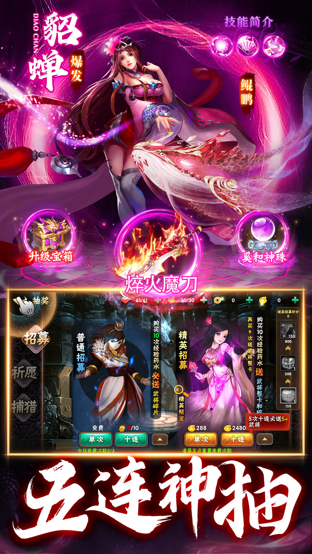 【新人必领福利】<br>SS级武将兑换码:SVIP888<br>价值128新人礼包:vip666<br>价值648新人礼包:vip888<br><br>手指间号令天下英雄,谈笑间横扫中原大陆! 紧张刺激的即时战斗,在纷争的战场上赢得胜利。 --变化多端的武将组合,在瞬息万变的战况中逆转局势。 --激烈壮阔的诸侯大战,豪迈的三国武将们在战场中奋力拼杀。 --精致华丽的游戏画面,酷炫的武将技能,美妙的游戏音乐,如果您喜欢玩三国游戏,那这正是您真正的不二选择!<br><br><br>游戏特色<br><br>【精美画面,视觉盛宴】<br>Q版帅气的英雄外形和技能特效,颠覆以往的威武形象,带给玩家不一样的视觉感官;<br> <br>【跨服交流,共同竞技】<br>多人跨服竞技,好友开黑打副本,社交娱乐两不误;<br> <br>【全新副本,玩法升级】<br>多种竞技、养成等玩法等你解锁,惊险副本奇遇频出,诸多玩法不会腻;<br> <br>【真放置,佛系也能爽】<br>自动推图,离线挂机享高额收益;