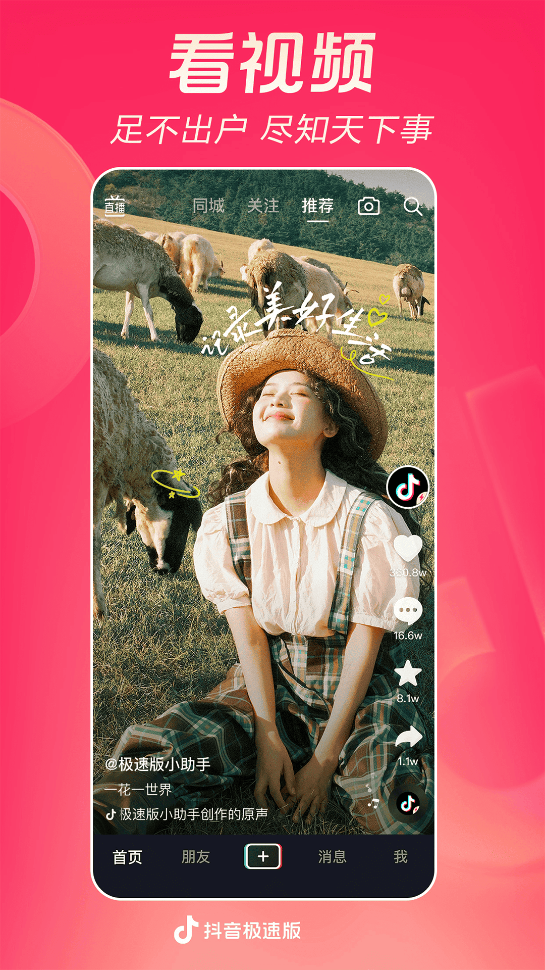 抖音,记录美好生活 每天,都有亿万人打开抖音,让生活变得更加美好。 看精彩直播 屏幕里的美好现场,陪伴你的每分每秒。 追上头短剧 剧情高能不断,看得开心,追得过瘾。 玩爆款特效 丰富装扮效果,上一秒甜美,下一秒酷炫。 看抖音精选 凭热爱创作的优质中长视频,让时间不虚度。 开启长辈模式 享受贴心关爱与陪伴,看得更清,用得舒心。 不仅如此,抖音还深入各领域,为美好生活,创造更多新可能。 拿起抖音,农特产发现新销路,宝妈找到新工作,小店迎来新客群;打开抖音,古籍焕发新生命,非遗等来满堂彩,知识也从庙堂传入市井;有了抖音,退休老人可以在直播间发挥余热,孩子们得以在线上课堂茁壮成长,公益事业也能人人可及。