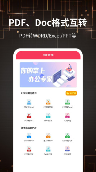 PDF转格式是一款PDF转换器的应用软件,为手机用户提供了十多种文件格式转换功能,用户可以轻松地处理各种办公文件格式的转换; PDF转格式提供了手机PDF转Word、Excel、PPT,或将Excel、PPT、Word转换成PDF文件,常见的Office文档与PDF文件之间相互格式转换,以及PDF转图片,图片转PDF; pdf转换器:性能稳定,运行速度快,pdf阅读器,pdf文字提取、pdf转图片; 免费的PDF处理工具:可以用于pdf拆分,pdf合并,pdf加水印,pdf加密,pdf解密等等,一键全搞定; 处理好的pdf,轻松查看,可编辑,可分享,可导出,方便又快捷! 【主要功能】 1.专业的PDF阅读器:支持Word、Excel表格、PPT、TXT、Docx以及图像浏览 兼容Adobe PDF、17 PDF Reder等其他阅读器PDF文档; 2.pdf转其他:手机PDF转化Word、图片、PPT、Excel、、TXT格式,帮助更方便的处理PDF文件; 3.其它转pdf:手机Word转PDF、Excel转PDF、PPT转PDF、JPG图片转PDF;