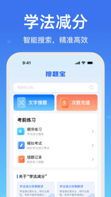 应用介绍 闯红灯?不小心扣分了?驾照分不够了?下载这个软件,通过学法减分让你的驾照分数重回巅峰! 学法减分拍照搜题 学法减分是:对国家出台的对驾驶人减免违章扣分的利好政策,驾驶人通过学法减分学习考试,考试合格一次 减免驾驶证累积记分1分,一个记分周期内最多减免<分,加上驾驶证12分,通过学法减分,驾驶证在一个记 分周期内最高可拥有18分用来处理违章。 学法减分搜题宝典APP有学法减分拍照搜题,学法减分题目搜题,学法减分打字搜题,学法减分模拟考试、错题集 学法减分顺序练习等功能,实时同步更新学法减分、考试题库,拥有最新的学法减分题库大全。【学法减分练习模块】 1、《模拟考试》:根据学法减分考试大纲要求,仿真模拟考试,提前模拟考试环境,帮助考生攻克考试重难点 2. 《错题集》:考生想通过自学习考试,考试错 的题目都会保存在错题集中,方便下次再次学习 3. 《顺序练习》:根据新的学法减分考试大纲,涵盖小车、客车、货车、摩托车,各地区题库实时更新。 根据新的学法减分考试大纲,涵盖小车、客车、货车、摩托车,各地区题库实时更新。