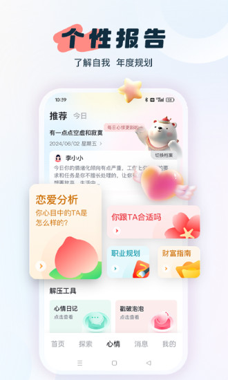 这是一款为用户提供专业的心理健康测试软件,专注为用户专业的心理健康测试及分析,包含抑郁症测试、焦虑症测试,孤独症特质测试,原生家庭底色测试等。 当你深受情绪的困恼时,当你身边的人不理解你时,当黑暗的夜将孤独的你包裹,焦虑、失眠、无助感袭来,你不知如何向亲密的人告诉你的感受,不妨借助这款软件来测测,这里有专业的分析及建议,有助于你更加了解自己的情绪,早点走出情绪的困恼。如果你想更好地探索自己的内心,这里有更多更专业更有趣的测试。 【心理健康】专业的综合心理健康评估,这是根据心理学家—L.R.Derogati健康量表的健康观,从感觉、思维、情绪等多个维度分析,根据你的测试结果,提供心理健康调节建议。当出现工作压力大、焦虑迷茫、抑郁、压抑,甚至出现头疼、失眠等一些症状,不妨测一测 【抑郁专题】我们提供抑郁专题心理健康分析,抑郁风险评估、抑郁思维模式评估、童年阴影评估、潜在心理创伤测试、消极思维模式评估、心理阴影测试等专业心理健康测评分析。 【心理测试】多种类型的心理测试,情感专题、性格挖掘、事业测评,让你更好了解自己。还有更多趣味测试等你来测!