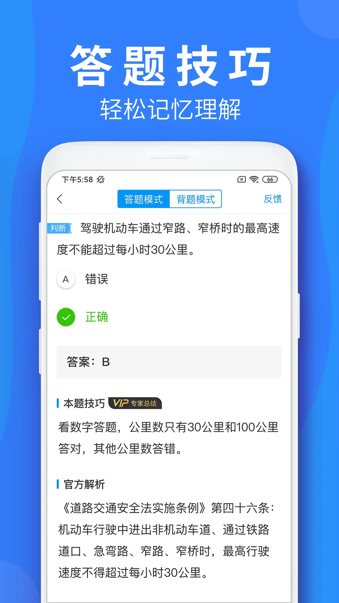 应用详情:懒人考驾照,是一款专业的驾考App。根据2023年《机动车驾驶学习及考试大纲》的教学要求,为您提供全部车型科目的驾考学习支撑,包括实时更新的全量免费题库、简单易懂的答题技巧、科一四1:1真实考场模拟、真人讲师教学视频等一站式驾考服务。 【精选答题技巧】 1. 技巧简单易懂:每道题都有技巧,不用死记硬背,只需记住关键字,快速答题做题; 2. 真人讲师带学:数十年经验驾考教学老师,直播解读2023考试知识点,细致讲解易错点、扣分点。 【2024驾考新规题库】 1. 题库足够新:根据新的驾考考试大纲,涵盖小车、客车、货车、摩托车题库,各地区题库实时更新; 2. 真实模拟考试:按照当前科目考试大纲要求,真实模拟考场规则,提前模拟考场环境,避免考试紧张。 3. 考试资料密卷:包括考试流程、速记技巧、交警手势图例等多维度精选资料,可下载打印纸质资料,拿在手里随时看随时学。 4. VIP精简题库:根据考点精选重点题目,攻克考点难点,高效备考省时省力