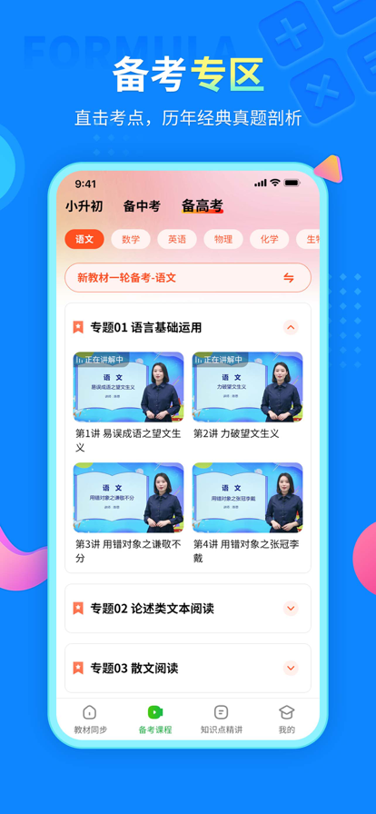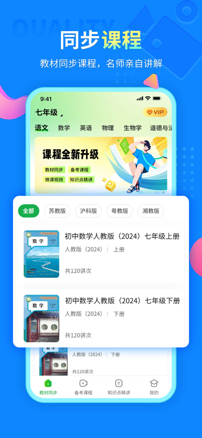中小学同步课堂包含、小学教学、初中教学、高中教学、初中同步课堂、面向全国中小学生教育教学的高清视频教学课程辅导宝典,是一款根据全国版本(人教版、部编版、苏教版、鲁教版、通用版)教材大纲开发的名师视频辅导APP、辅导视频宝典涵盖了小学学习、初中学习、高中学习各阶段知识点同步教学体系课程,能够帮助全国中小学生有效地进行课前 预习和课后复习同步精讲。通过名师教学团队对中小学教育教学中的知识点通俗易懂的讲解与剖析,帮助学生精准的查缺补漏,轻松掌握知识点,让学生快速提分。 【高中教学】 高中视频教学课程涵盖了高一教学、高二教学、高三教学的语文、数学、英语、物理、化学、生物、政治、历史、地理等高清视频教学内容。 名师团队根据近年来各地考试情况的分析,对考试重点的把握,精心设计的一系列课程教学视频,内容紧扣高考大纲,同步精讲,考试拓展,包括重点难点以及单元讲解。清晰的视频知识节点划分,方便高考复习回顾,为科目提分加油。 【初中教学】 初中视频教学课程涵盖了七年级、八年级、九年级的语文、数学、英语、物理、化学、历史、政治、生物、地理、中考、初一教学、初二教学、初三教学等高清视频教学内容。 初中名师教育队伍初中课程同步教学,基于近年来各地考试情况的分析,对考试重点的把握,精心设计的一系列课程,紧扣大纲,同步精讲,考试拓展,还有针对中考的复习讲解。为学生进入重点高中加油助力。 【小学教学】 小学视频教学课程涵盖了一年级教学、二年级教学、三年级教学、四年级教学、五年级教学、六年级教学的语文、数学、英语等高清视频教学内容! 小学教育课程同步教学,以视频的形式对重要的基础进行讲解,针对小学生作业、习题、背单词、英语口语、阅读理解、作文等问题,可以科学的掌握学习的方式方法与解题思路技巧,提高家长对孩子的课后辅导效率! 视频提供网上教学、线上教学、在线教学资源 提供小学:语文作文、教学运算、数学视频、英语口语等各类精品课程 支持初中:英语视频、数学重难点讲解、语文各版本内容讲解等精品课程,助力中考冲刺 支持高中:语文、数学、英语、历史、地理、政治、化学、生物全科精品课堂讲解,课程支持无限回放,名师讲解课程重难点。