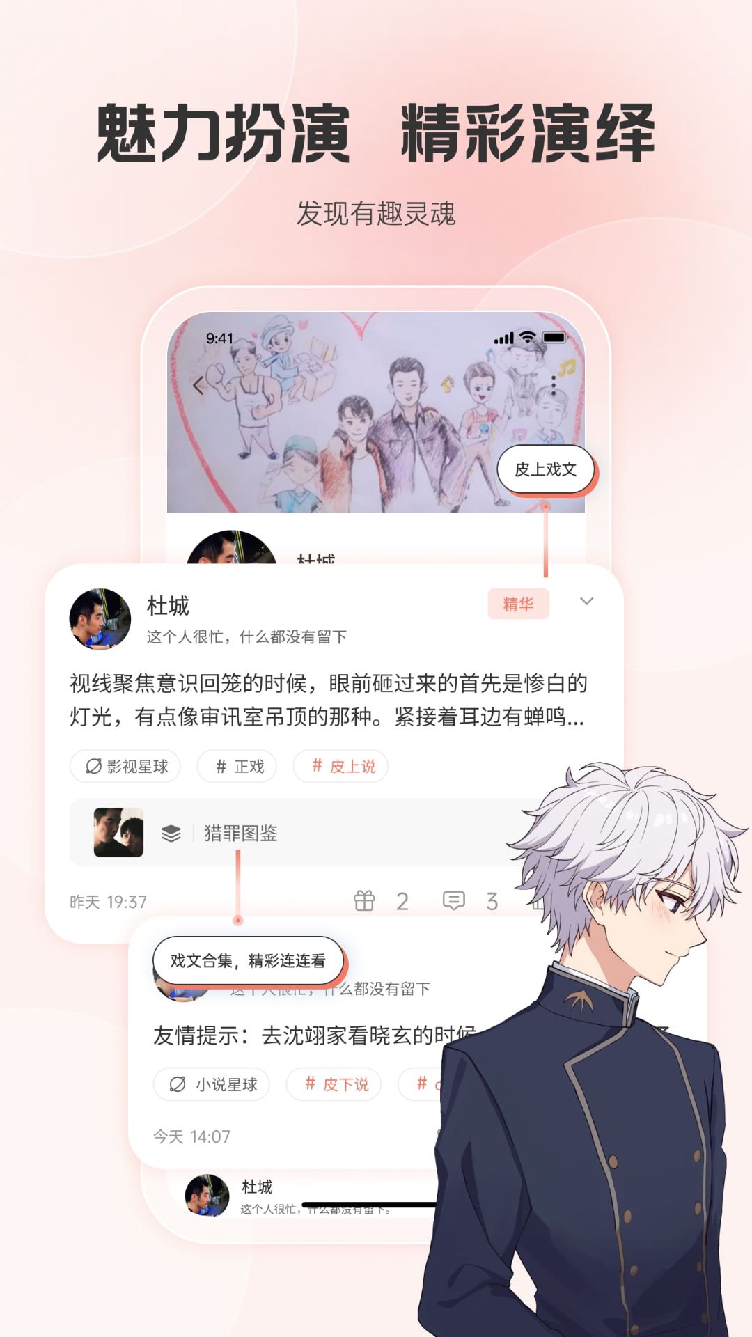 同类星球,与有趣的同好,遨游在理想世界 无限想象,原创人设/影视/游戏…海量星球任你的想象力翱翔 随心交友,皮上还是皮下,你说了才算 自在扩列,人海茫茫,一秒匹配 保护原创,每一次修改,每一次创作,我们都帮你记录