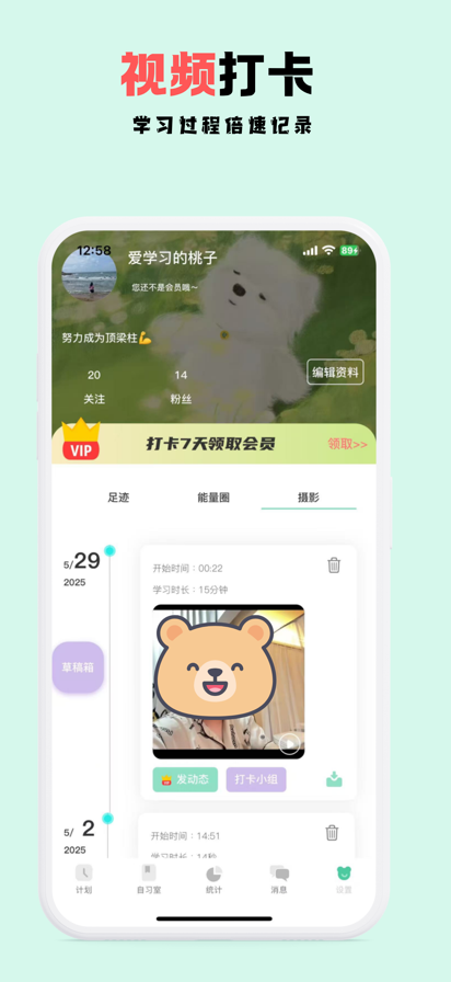 还在为一个人学习难以坚持而烦恼?无论你是备考考研、考公考编,还是日常学习、语言进修,【面对面自习室】都能为你打造一个真实、高效、有仪式感的学习空间! 本应用专为学生和考研人群设计,通过三大核心功能帮助你建立自律学习习惯: 1. 视频打卡生成学习Vlog:开启摄像头真实记录每一次学习努力,一键生成专属学习Vlog,直观回顾成长轨迹。支持横屏/竖屏录制,学完自动剪辑,让你的学习过程可视化、有成就感! 2. 学习小组自习:创建或加入学习小组,与研友/学友连麦学习,共同监督。支持多人静音连麦,避免干扰,每隔30秒自动刷新学习画面,确保专注。更有全球同频自习室,与来自各地的学习者一起学习,氛围感拉满! 3. 专注计时器与数据统计:提供番茄钟(、自习计时、倒计时等多种模式,科学管理学习时间。全面记录每日学习时长、专注度,并生成周报/月报图表,让你的进步看得见! 此外,【面对面自习室】还提供: - 环境模拟功能:自定义自习室背景,搭配白噪音,打造沉浸式学习体验 - 学习日记手账:以翻书式手账形式记录每日学习内容,形成完整的学习闭环 - 无广告纯净模式:界面简洁,启动速度快,无弹窗干扰 学生党必备:告别宿舍摸鱼,用视频打卡约束自己,用学习小组激励自己,让自律变得简单有趣! 考研党利器:备考路上不再孤单,与研友一起学习,互相督促,用学习数据可视化自己的进步,用学习Vlog记录奋斗历程! 现在下载,开启高效学习之旅,让自律成为习惯!
