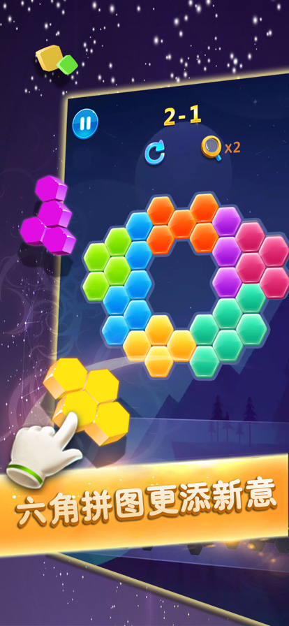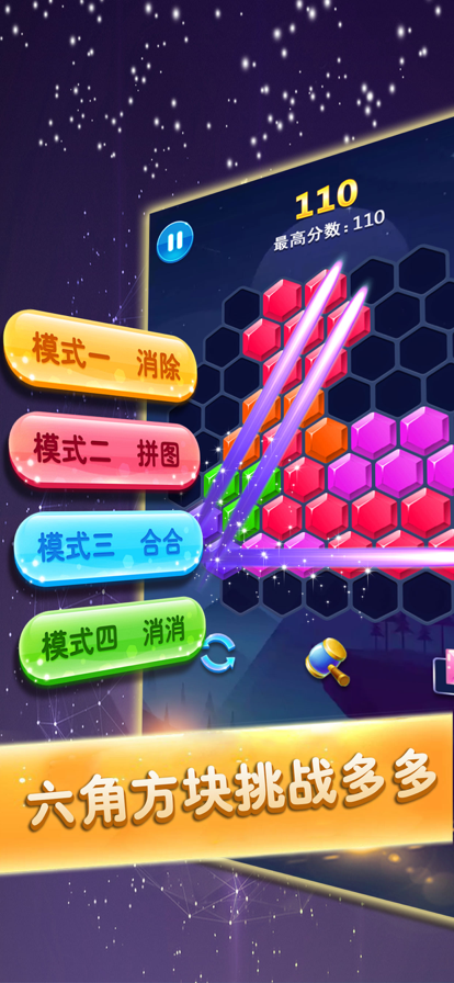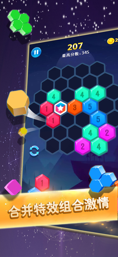六边形的纵横变换,创意满满的智力大考验,六边形消除将带给你别具一格的消除盛宴!易懂 难精的多种创意玩法,益智耐玩的关卡设计,华丽的消除特效,带你走进六边形的世界,精彩 不容错过! 消除模式:拖动下方的六边形碎片到六边形棋盘中,创造并消除完整的一行或多行的线条,并 通过连击消除来获得更高的分数。 拼图模式:拖动下方的六边形小方块到不规则的多边形棋盘中,当拼凑出指定的多边形图形时 ,即可通关。 合合模式:拖动带有数字的六边形小方块到六边形棋盘中,3个以及更多相同数字的六边形块可 以合并成一个更高的数字块,当合成最高数字之后可以消除周围的几圈数字方块。 消消模式:玩法与合合模式相似,但是下方的六边形小方块可以旋转。 如果你还在苦恼闲暇时光无处打发,那就快来挑战这款充满魔力的六边形消除吧!