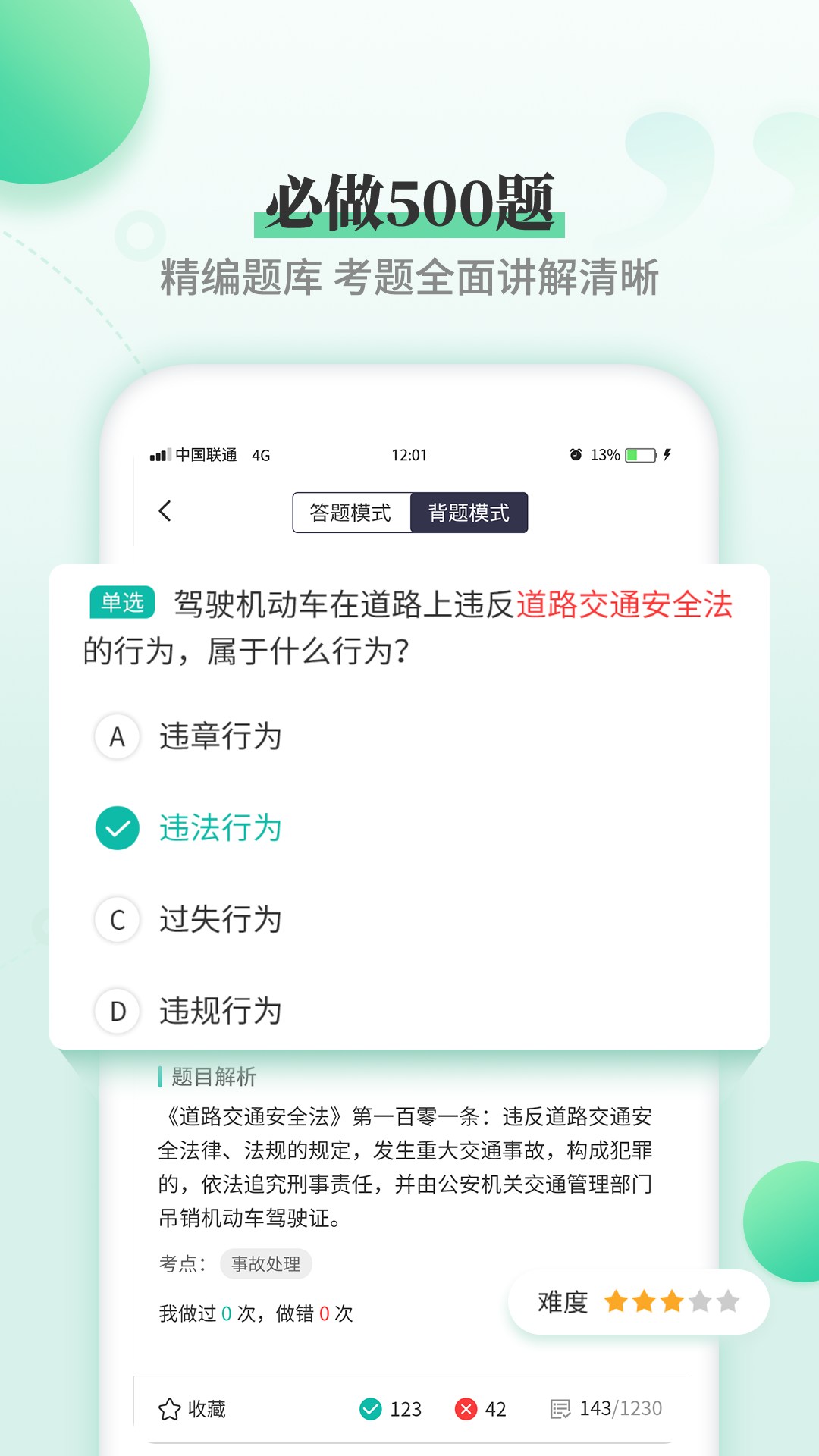 --== 技巧练题,顺口溜记 ==-- <br> <br>驾考越来越难了,以前几百道题,现在已经2千多题了。 <br>如何快速刷题,快速通过考试?一起驾考,为您精心整理了各项学习方法。 <br>你只要记忆少量的技巧,就可以刷掉近1/3的题目,再加上精简500道题,以及考前密卷、考前冲刺,确保你能快速通过考试,如果考试不通过,全额退款! <br> <br>✔ 精简题库:没时间?没耐心?想一次就过考?精选必做500题,VIP专属精简题库。 <br>✔ 答题技巧:没基础?多次刷题记不住?VIP专属技巧讲解,理解简单,讲解有趣,轻松记忆。 <br>✔ 精选易错:上亿大数据智能筛选,易错易混,各个攻破,考试必过! <br>✔ 考前冲刺:科一、科四考点查漏补缺,临阵磨枪,又快又光! <br>✔ 必学新题:即时更新 针对学习 <br>✔ 考前密卷:绝密真题 运算揭秘 <br>✔ 难题攻克:模考考试 难题排雷 <br>✔ 考场模式:真实还原 电脑界面 <br>✔ 懒人听题:听题模式 轻松刷题 <br>✔ 满分教育:扣除12分 重新出发 <br>还有更多... <br> <br>一起驾考,我们一起通过考试,早日拿到驾照!