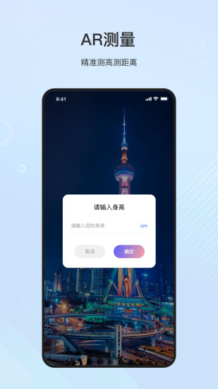 测量身高、测量物体高度建筑高度、测量距离、测量角度、水平测量、长度测量,这是一款AR测量工具软件,集合了日常生活中常用的一些测量工具,在没有测量工具的时候,随时随地掏出钱手机就能进行物体的测量,显示角度,无论室内外都可测量,尤其适合木工、建筑工人使用,是居家必备尺子测量测距工具箱。 【测高测距】只需三步即可测出孩子的身高、远方高楼的高度,输入身高-对准物体底部拍照-移动建筑顶部拍照,即可准确测出楼的高度。操作简便 【测量工具箱】长度测量、量角器、水平测量仪集多款测量测距工具于一体,解决小日常的问题。还可进行长度、体积、面积、重量的单位换算,不但日常生活及工作中所需,有时辅导孩子学习作业还能派上用场。 【户外助手】指南针、手电筒户外徒步探测过程中需要用到的工具一一为你考虑。还有高清镜子可用,尤其在户外忘了带镜子的情况下,AR测量工具在手,这些都是小问题。是旅游、户外探测、户外徒步、户外运动的实用工具箱。 【居家必备】分贝仪,测量环境的嘈杂情况,测量加湿器的噪音,打开分贝仪即可随时为你展示实时分贝噪音环境情况。为你打造安静舒适家提供小小帮助,还有放大镜可以用。