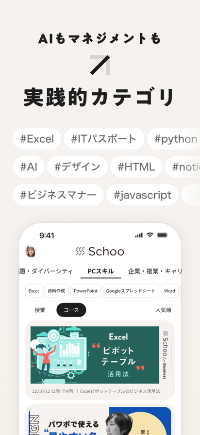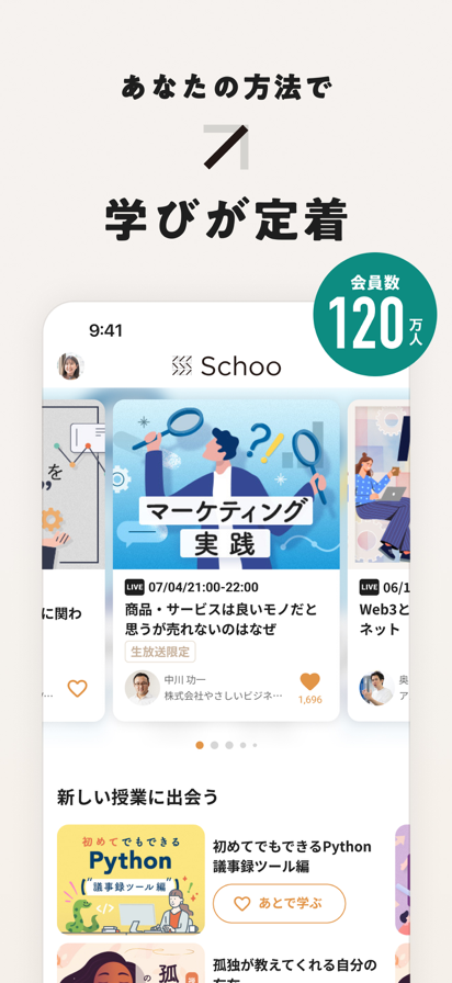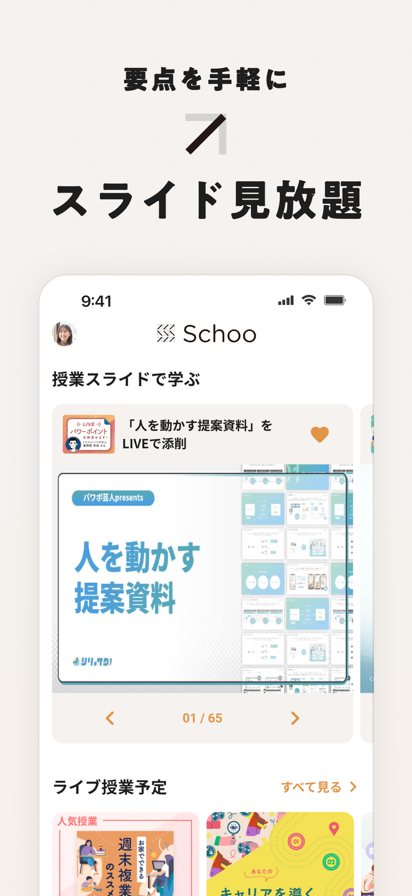 【Schoo(スクー)はこんな方におすすめ】 ・仕事で輝ける、今の時代に必要なスキルを身につけたい。 ・最前線で活躍している、実績ある人の授業を受けたい。 ・ライブ授業で質問・相談しながら学びたい。 ・わからないところは何度もじっくり復習したい。 ・楽しく続けられる方法で学びたい。 ・旬なトピック・普遍的なテーマのどちらも幅広く学びたい。 ・デジタルテクノロジー分野の知識を学んで仕事の幅を広げたい。 ・プログラミング・デザイン・マーケティングなどのスキルを身につけたい。 【Schooの特徴】 ・法人や地方自治体の研修や人材育成でも活用されるハイクオリティな授業を生放送で365日間ライブ配信。 ・現役の経営者・エンジニア・デザイナー・コンサルタントなど幅広いジャンルの専門家が先生として登壇。 ・生放送の授業なら、タイムラインのチャットで質問・コメントしながら受講できて参加は無料。 ・合計9,000本以上の膨大な録画された授業を何度も見返せる(録画授業の視聴はプレミアムプラン加入が必要です)。 ・難しい内容も、テレビを見ているように噛み砕いた授業なのでわかりやすく、続けられる。 ・授業内容はビジネススキル基礎から教養まで幅広いので飽きずに続けられる。 ・DXやプログラミングなどのデジタル・テクノロジー関連の旬な分野もしっかり学べる。 ・デザイン・マーケティングなどのビジネススキルもしっかり身につけられる。 【学べるジャンル】 ・ビジネススキル基礎(ビジネスマナー・ロジカルシンキング等) ・企画・マーケティング ・起業・副業・キャリア ・プログラミング(Python,Javascript,SQL,JAVA,PHP,CSS等) ・DX ・マネジメント・リーダーシップ・コーチング ・グラフィック・視覚デザイン・Webデザイン ・経済・政治・社会 ・テクノロジー ・お金・FinTech ・英語・語学 ・教養・学問 ・OAスキル ・思考術・自己啓発 ・フィットネス・ヘルスケア ・趣味・その他 【録画授業について】 ライブ配信を録画した授業動画のアーカイブは合計9,000本以上を公開中。「いま大人が勉強して身につけておきたいこと」が幅広く学習できます。大人の学び直しやリスキリング/リカレントが必要な時代。気軽に学べる生涯学習のオンラインスクールとしてご活用ください(録画授業を閲覧するにはプレミアムプランの登録が必要です)。 【コンテンツについて】 「未来にむけて、いま学んでおくべきこと」をコンセプトにした授業をビジネスパーソン向けに制作。毎日開講される生放送授業への参加は無料。旬なトピックスや最先端の学びを、自社スタジオがあるからこそ可能なタイムリーさで配信しています。生放送は録画授業としてストックされ、その後オンラインでいつでも学習が可能です(録画授業を閲覧するにはプレミアムプランの登録が必要です)。 【先生について】 1,800人以上の業界・職種問わずさまざまなジャンルの講師が登壇。各領域の専門家に加え、スタートアップ企業の経営者・大学教授・デザイナー・エンジニア・インフルエンサー・コンサルタント・ベストセラー作家・医師・アートディレクターなどなど幅広いジャンルの「先生」が登壇し、わかりやすく・ためになる授業を展開します。また資格取得に役立つ授業もあります。 【ライブ配信/生放送授業について】 会員数90万人突破! 生放送中の累計コメント数は23万件超え。一方通行のeラーニングではなく、先生にチャットを通じて質問ができたり、受講生同士でディスカッションができたり、参加者同士のコミュニケーションを伴う学習体験を通じて、ビジネスパーソンを中心に多くのユーザー様にご利用いただいています。 【プレミアムサービスについて】 プレミアムサービスは「オプション」であり必須ではありません。無料で利用を開始することができます。生放送授業は無料で利用可能です。 ■プレミアムサービス(プレミアム学生プラン/オプション)とは? 録画版の授業が、すべて受講できるようになります ※生放送の授業を編集したものになります(※毎日追加) ※授業数は9,000本以上 ■プレミアムプランの価格と期間 ・980円(税込)/月 ■プレミアムプランについて ・お使いの iTunes アカウントに課金されます。 ・停止の手続きを行うまで、自動で更新されます。 ・停止の手続き後、有効期間終了まではプレミアムプランをご利用いただけます。 ・停止、再開は「設定」アプリの「iTunesとApp Store」>「Apple ID」>「AppleIDを表示」>「登録」の下の「管理」から行えます。 ・停止の手続きは有効期間終了の24時間前までに行う必要があります。有効期間終了まで24時間を切ると次の更新の請求が発生しますのでご注意ください。 ・ Schoo(アプリ、ウェブサイト全て)からプレミアムサービスの解約を行うだけでは自動更新は解除されません。 ------------- ◆ お問い合わせ・不具合の報告 ------------- お問合せ先:support@schoo.jp レビュー欄に不具合やご要望を頂戴しても回答できないことがあります。上記のメ