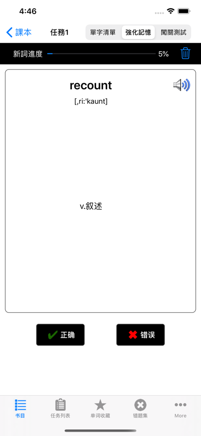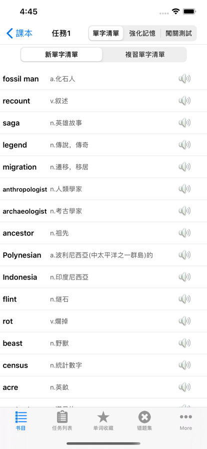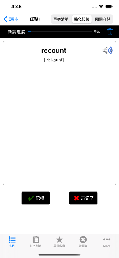 List背单词,一款可离线使用,艾宾浩斯规划,支持PDF导出,简洁高效的背单词软件。 功能特性: * 「内置词库」:包含四六级、考研、出国、大学、高中、初中、小学等各个阶段的词库,还有新概念英语、BEC、COCA、剑桥、朗文、牛津等其他词库。 * 「学习计划表」:根据艾宾浩斯记忆规律曲线,持续记忆和不断复习; * 「自定义词库」:支持外部文件导入; * 「生词本」:汇总重难词,集中强化记忆; * 「熟词表」:移除熟词,词库越学越小; * 「双语/单语」:快速切换双语/单语模式,方便自测自查; * 「iPad分屏」:利用分屏功能,边听边写; * 「词典查询」:内置英汉/英英词典和在线词典,支持“用户自行添加在线词典”; * 「英式/美式」:支持英式/美式发音+音标; * 「iCloud同步」:iPad/iPhone记录同步,学习进度不丢失; * 「拼词模式」:从五个卡片中点选正确的字母,拼成完整的单词,同时还支持键盘输入。iPad上,还支持Pencil手写输入; * 「听写模式」:可重复可间隔可循环可自动,英汉双语音频播放; * 「英英模式」:通过英语释义、同义词和例句,加强记忆,扩展词汇量; * 「滚动模式」:列表样式,自动循环滚动播放; * 「定时关闭」:听写模式和拼词模式,支持多次循环后关闭,或固定时长后关闭; * 「音频混合」:支持其他音频app混音,边听歌边记单词; * 「批量导出」:支持批量导出词汇到「List生词本」App; * 「桌面小组件」:iOS 14及其以上系统,支持快速查看学习进度和打卡情况; * 「文字大小」:支持跟随系统文字大小变化; * 「PDF导出」:支持内置词库、自定义词库和生词本的PDF文件导出。 背单词,是英语学习之路上必要的过程,词汇量不够,直接影响到英语的使用,单词记不住,是必须打败的拦路虎。人的遗忘速度随时间的流逝而先快后慢,在记忆的最初阶段遗忘的速度很快,后来就逐渐减慢了,到了相当长的时候后,几乎就不再遗忘,因此及时复习对于记忆单词是非常重要的,这就是艾宾浩斯记忆法的原理。 List背单词,根据艾宾浩斯的记忆规律来使用,第一个Day记忆单词,后续的复习间隔周期为:`1`个Day,`2`个Days,`4`个Days,`7`个Days和`15`个Days,假设把单词词库平均分为`15`个list,在`30`个Days的时间里持续记忆和不断复习,由此制作了一份学习计划表。 * 乱序版本:词库随机打乱分配到每个List * 正序版本:词库按A-Z的顺序分配到每个List * 原序版本:词库按数据源本身的排列顺序分配到每个List --- 学习计划表设置 --- 通过调整List总数,把单词词库进行平分,得到平均词汇量和总天数,选择乱序或正序(原序)版本,由此得到一份学习计划表。 --- 自定义词汇 --- 支持两种导入方式:从生词本导入和从外部文件导入 --- 英语口音支持 --- 美国,英国,澳大利亚,爱尔兰,南非,在线美式发音,在线英式发音,离线真人语音 --- 背单词方式 --- 初始的排列,按字母升序排序,随机打乱排序,不会的词排在前面。 其中,关于初始的排列,在以下三种版本中的解释: 1.正序版:没有“初始的排列”,默认就是按字母升序排列; 2.乱序版:“初始的排列”,是指保持一个初始的打乱排列; 3.原序版:「自定义词汇」的词库专有,“初始的排列”,是指保持数据源本身的顺序。 --- 单词显示设置 --- 双语显示,只显示英文,只显示中文 1. 只显示中文时,向左滑动单词行,可以看到英文单词; 2. 只显示英文时,向左滑动单词行,可以看到中文释义。 --- 单词行点击设置 --- 1. 默认设置,点击单词行,有发音,蓝色标记颜色加深,‘不会程度’增加一; 2. 点击单词行的左半部分,只有发音,右半部分,保留默认设置; 3. 点击单词行的右半部分,只有发音,左半部分,保留默认设置; 4. 点击单词行,只有发音,蓝色标记颜色不加深,‘不会程度’不增加一。 --- 音标显示设置 --- 隐藏音标,英式音标,美式音标 --- 生词本 --- 1. 单词列表里,向右滑动单词行,点击星星按钮,收藏单词到生词本; 2. 手动修改单词; 3. 手动添加新单词; 4. 多种排序方式:从新到旧,从旧到新,从A到Z,从Z到A,随机乱序。 备注:生词本里修改中文释义,词库里的释义会跟着改变;从生词本删除单词,词库里的释义会恢复成原来的 --- 熟词表 --- 1. 词列表里,向左滑动单词行,点击红色叉号按钮,添加到熟词表; 2.长按底部当前List,可以进入熟词表,进行恢复。 --- iCloud同步 --- 支持iCloud同步学习进度、生词本和自定义词汇 --- 显示模式 --- 白天,夜间,纯黑,纸张白,纸张黑,支持跟随系统,在线词典支持深色外观 --- 词典设置 --- 1.长按单词行,复制单词到剪切板,默认不开启; 2.长按单词行,使用词典查询更多释义和例子,包括查询关闭、内置词典和多种在线词典; 3.在线词典,支持调整顺序。 --- 拼词模式 --- 1.从五个卡片中点选正确的字母,拼成完整的单词; 2.随机打乱; 3.快速定位; 4.支持键盘输入; 5.在iPad上,支持Pencil手写输入。 --- 听写模式 --- 1.调整播放单词重复次数; 2.调整单词间隔时间; 3.设置是否自动播放下一个; 4.内容显示设置; 5.支持后台播放音频; 6.支持播放中文释义; 7.随机播放; 8.快速定位。 --- 英英模式 --- 通过英语释义、同义词和例句,加强记忆,扩展词汇量 --- 滚动模式 --- 1.列表样式,自动循环滚动播放; 2.更方便的生词本编辑、不会程度标记和词典查询等操作。 --- 批量导出 --- 1.支持把当前List的词汇批量导出到「List生词本」App; 2.支持把生词本的词汇批量导出到「List生词本」App。 --- PDF导出 --- 1. 主页面点击