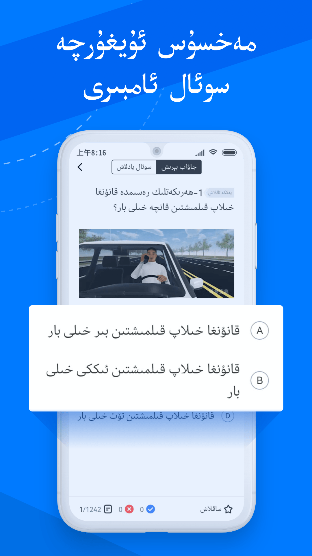 驾考宝典隆重推出维语版软件啦!本软件为维语用户量身定制的小车题库,书写延续维语用法自右向左书写,同步至全国2026年新版考试题库!<br><br>【开发背景】<br>少数民族语言文字造就中华文化的多样性,是中国文字史的重要组成部分,为民族文化的发展提供了重要支持。世界上大概每天有许多语言文字消失,保护民族语言文字的多样性具有重大历史意义,驾考宝典将响应号召,励志解决全国人民不同地区的学车需求。<br><br>【产品特色】<br>1、试题练习:顺序、随机、专项等多种练习模式,助你更快掌握理论题库<br>2、模拟考试:全真模拟考试,科目一、科目四考试满分通过宝典<br>3、错题收藏:自动收录错题、一键收藏难题,宝典帮你全方面复习<br>4、图标速记:巧妙记忆交通标志、交通法规,全力冲刺驾校考试<br>5、知识扩展:驾考易错题、重难点一键巩固,让每个学员考试无忧