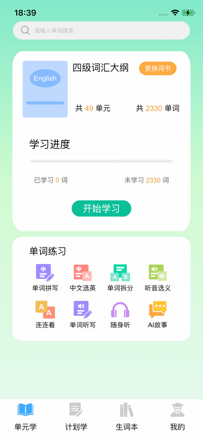 英语单词学习是一款依据艾宾浩斯曲线来记忆英语单词的工具软件。 主要功能: 1、单词书:词书覆盖小学、初中、高中、大学等各个阶段,满足各类人群学习需求。 2、计划学:根据自身需求,依据艾宾浩斯曲线来记忆英语单词,制定个性化学习计划。 3、单元学:单词按照单元,进行单词拼写、中文选英、单词拆分、英文选义等训练,让单词记得更牢固。 4、生词本,将平时学习中遇到的生词难词录入进去,帮助学习和记忆。