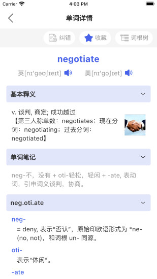 图样词根词典,基于世界记忆大师高效记忆法,结合搞笑漫画,高效记词根,成倍扩大词汇量!助你方便快捷查单词、查词根、查词缀。 目前已经涵盖小学、初中、高中、四六级、考研、专升本、出国等各个级别的单词。查单词、背单词、学英语必备软件! 【漫画记词根】 基于世界记忆大师的高效记忆法,通过“合理拆分+趣味联想+搞笑漫画”的形式来记忆词根,轻松记住词根。 【词根词缀-思维导图】 通过词根、词缀的学习,认识单词的“偏旁部首”,成倍扩大词汇量。同时,还会列出相同词根的单词,以词根树(思维导图)的形式展示,科学溯源,单词关系一目了然,学习更系统。 【派生记忆】 一个家族的单词都被整理成派生树。利用前后缀拓展单词,科学记单词,倍速扩大词汇量。 【搜单词】 查单词,涵盖小学、初中、高中、四六级、考研、专升本、出国等各个级别的单词、包含1000+词根、300+词缀,中文释义+漫画帮助理解、记忆单词。 【背词+定制学习计划】 学、测一体的背词模式。支持背单词、背词根、背词缀等方式分类背词,词根优先背。开启背词提醒,养成良好背词习惯。 【联系我们】 官方微信:tuyangjiaoyu 欢迎大家交流背单