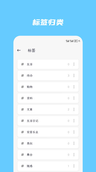 “便签”一款记事、便签、计划任务、写日记、写小说、记录灵感的备忘录载体。该软件可以自动同步云端存储,多重数据防护,让备忘录更加安全可靠。无论你是白领、作家、销售、宝妈等都可以满足您的记事、记账、备忘提醒、代办事项、笔记、记录会议、写小说、便签,还可以随手记录您的生活点点滴滴。 【功能】 强大的记录功能 • 新建笔记,记录你的工作生活点点滴滴。 • 数据加密访问,设置必要数据安全密码。 • 多样式分类管理,让你的笔记更加直观明了,外加收藏功能,重要信息一眼展示。 • 富文本编辑器内置丰富文本样式,如标题或正文、项目符号列表、字体样式等。 • 快速搜索,更好查找笔记内容。 • 数据多重保护,历史版本数据实时回滚,轻松定位某个时间笔记内容。 • 数据、图片云端同步保存,避免切换设置,数据无法同步问题。 • 高效任务管理,更好管理您的时间。