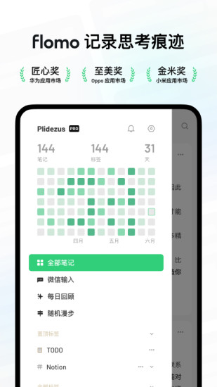 百万终身学习者的新选择, AI 加持的卡片笔记工具。 曾获得华为应用市场「匠心奖」「优质体验奖」,《笔记的方法》《卡片笔记写作法》官方推荐笔记应用。 flomo 浮墨卡片笔记,是应对碎片时代而诞生的新型笔记工具,秉承德国社会学家尼克拉斯 · 卢曼的方法,帮你从一张卡片开始,积累自己的知识资产。 作为普通人,flomo 究竟能帮你做到什么? - 有效提高学习质量,阅读质量,帮你记忆的更加牢固。 - 帮你有效提高考试分数,适合考研,自考等各种考试。 - 终生免费多平台同步,让你在任何设备上都可随时记录和检索。 - 帮你随时积累各种生活和工作中的知识,输出不再困难。 - 把散落的知识和想法关联起来,创造自己独特的知识资产。 flomo 是如何帮你做到上面这几点的呢? 【记录更多】 - 像发微博一样,快速记录想法和灵感,还支持语音输入 - 极简设计,仅支持最基本的文格式,拒绝排版布局的困扰 - 支持在微信内通过服务号记录,无需打开 App 【回忆更好】 - 通过 App 内功能,桌面小部件,微信推送,系统推送等方式,让过去的记录再次发挥价值。 - 让过往记录发挥新价值,增强记忆降低遗忘。 【AI 加持】 - 相关笔记:智能探索笔记间隐藏的联系,扩展深度,启发新视角。 - 找一找:用问题挖掘过往的笔记,寻找启发当下的线索。 【云端同步】 - 覆盖 App、Web、PC 等平台,确保你的笔记随时存取 - 不限同时登录客户端数量,随时随地查看 - 终身免费云端同步,不限流量 【轻松整理】 - 不必担心内容散乱,独特的多级标签系统,让整理知识更轻松 - 高级搜索可以根据笔记属性、时间、分类快速搜索 【量化记录】 - 通过可视化热力图,量化记录习惯。 - 每月汇总记录统计,让成就一目了然 【插件丰富】 - 支持导入微信读书、得到、有知有行、多看、Kindle 等多种产品 【改变思维】 - flomo 帮助中心中,整理了大量关于做笔记的思维方式资料,助你认知升级。 【生成知识卡片】 - 把笔记生成为知识卡片,分享至小红书、微博、微信和好友 flomo 的适用场景: - 随手记录:记想法、做笔记、贴便签、列清单待办、做备忘、写大纲、摘录知识点、康奈尔笔记、灵感笔记、记忆卡片 - 个人知识库:记录想法、记录知识、记播客金句、记今日得到、写wiki、写大纲、摘录电子书与听书笔记、做课程笔记、同步动态与聊天记录 - 个人日记本:记录情绪、心情、一个念头、生活清单、记账单、习惯养成打卡 - 个人金句卡:将思维金句导出为精美的图片分享 flomo 不擅长做什么: 我们深知做好一件小事就已经很不容易,所以不会试图在功能层面 All in one。 下面是我们不擅长的领域,推荐诸位选择更好地产品。 【不擅长做 文档撰写或 markdown 编辑工具】 【不擅长做 网页全文收藏收藏】 【不擅长做 TODO 提醒】 【不擅长做 思维导图/脑图】 ———————————— 【flomo 也格外注意隐私和安全】 · 所有内容仅用户自己可见 · 所有的数据传输均有加密 · 无商业广告计划 · 不贩卖用户个人数据 · 数据库实时异地双备份 ———————————— 【订阅 flomo PRO 解锁全部功能】 解锁 PRO 会员后,即可解锁 · 每日回顾:通过设定条件,每日回顾过往内容 · 相关笔记:智能探索笔记间隐藏的联系 · 找一找:通过问题挖掘过往的笔记 · 20G 存储空间:支持上传原图 · 反向链接:查看有哪些内容链接至此 · 密码锁:保护你的笔记隐私 · 标签表情:支持在标签中添加 emoji 更加醒目 · API 输入:支持众多第三方输入方式 · 统计图表:发现自己独特的记录行为 · 语音转文字:最长支持达 5 分钟记录 · 启动即输入:记录想法更快一步 · 单笔记 18 张图片:丰富笔记内容 · 更多 flomo PRO 专享功能陆续开发中 ———————————— 商务合作请联系:bd@flomoapp.com
