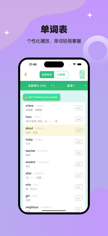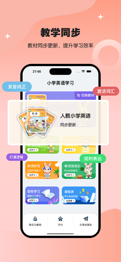 人教版英语同步学,是每位小学生英语学习的得力助手。我们专注于打造一个高效、互动、有趣的自主学习平台,让孩子们在轻松愉快的氛围中掌握英语知识。 【个性化单词表】 我们的单词表功能不仅提供标准发音,还能根据每个孩子的学习进度和记忆曲线进行个性化调整。单词记忆不再枯燥乏味,而是变成了一场有趣的探索之旅。 【互动式单词跟读】 模仿是学习语言的重要一环。人教版英语的单词跟读功能,让孩子们能够听到专业发音,并立即模仿,实时反馈发音准确性,确保每一个音节的发音都清晰、标准。 【智能单词听写】 通过智能听写练习,孩子们可以巩固所学单词,提升听力与拼写能力。系统会根据回答情况智能调整难度,确保学习效率最大化。 【生动听课文】 人教版英语精选课文内容,配以生动的朗读和丰富的情境图片,让孩子们在沉浸式听力练习中,提升理解力和语感,让课文学习变得生动有趣。 我们相信,每个孩子都拥有无限潜能,人教版英语就是那把钥匙,帮助他们解锁语言学习的大门。现在就下载人教版英语,让我们一起在英语的世界里遨游吧!