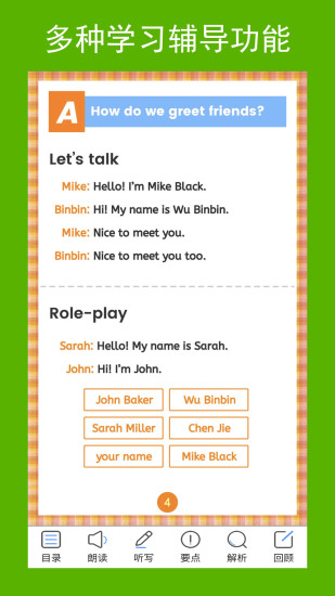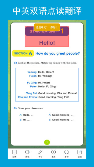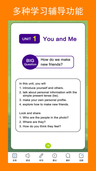 人民教育出版社官方出品,专为中小学生量身打造,配套中小学英语教材,提升综合语言运用能力。 【1-9年级英语教材点读】 手机秒变课本点读机,复读、连读、评测,即点即读,简单易学。 【教材配音秀学习有意思】 化身教材小主角,大胆开口演绎自己的英语课本,1000多个生动有趣的教材动画,等你“声”临其境,摆脱枯燥无味的英语学习。 【朗读与背诵】 朗读、背诵是学好英语的必经之路,每天一个小目标,循序渐进,帮你啃下硬骨头! 【智能测评口语闯关】 跟着教材练口语,权威语音引擎,逐句打分纠音,2000组学生生活场景对话,集成趣味闯关,口语越练越好! 【大咖领读教材】 英语大咖赖世雄逐页领读教材听说重点;从小培养良好的发音习惯,掌握正确的学习方法;模仿优美的语音语调,增强开口说英语的兴趣。 【与教材同步背单词】 按教材单元,提供单词的形象化记忆、听写、自然拼读、语音评测。 微信公众号获取更多学习资讯:人教数字教育(rjszjy)