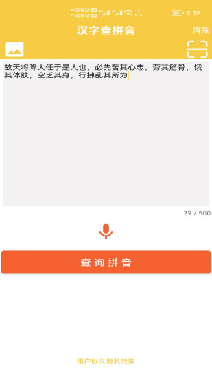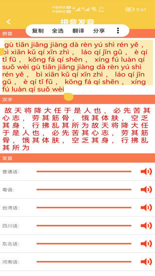 汉字转拼音(带声调)是一款支持汉语发音、字典辞典、成语词典、诗词曲赋文、绕口令等等的普通话学习助手,乃学习常用工具软件。是您远离生僻字、学好一口标准普通话的好帮手,汉字笔画顺序动画分解,字帖描红练习书写。 1、汉字转拼音(汉字转注音):支持字、词、句带声调的全拼或注音符号发声,拼音字母表,aoe基础朗读,声母韵母音节组合朗读; 2、汉字笔画:支持动画演示,字帖描红练习临摹书写; 3、拼音查汉字(同音字):输入拼音即可查找对应的汉字,支持全部拼音组合检索,支持拼音加声调查询(如:bing1); 4、多音字查询:录入4000多多音字,不同发音词组,还有经典例句,汉字转拼音语句支持常用多音字语句识别; 5、词典功能:辞典(字典、词典)、古汉语常用字字典、成语词典(离线,解释、典故、例句)、同义词反义词; 6、押韵助手,通过算法获得押韵的字、词、成语,为学习创作提供便利功能; 7、绕口令:训练普通话口语的传统语言游戏,将声母、韵母或声调极易混同的字,组成反覆、重叠、绕口、拗口的句子,要求一口气急速念出; 8、拓展知识:带拼音唐诗宋词元曲文赋,古今中外名人名言库,趣味歇后语,脑筋急转弯,猜灯谜