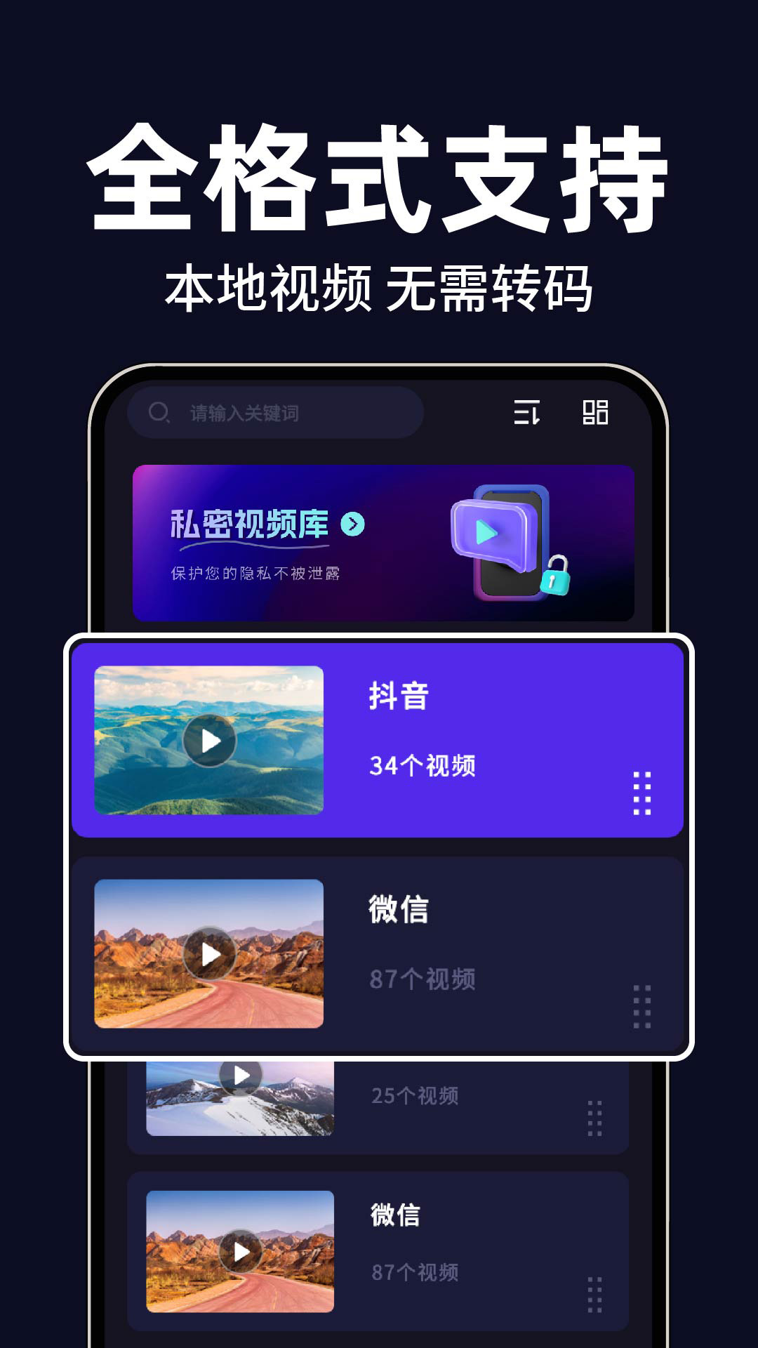私密无痕播放器是一款专为追求隐私保护和极致观影体验的用户设计的多功能视频播放应用,旨在为用户提供一个安全、便捷且高效的本地视频观看平台。<br>密码隐私保护<br>设置复杂的密码,增强隐私保护。只有输入正确的密码,才能访问私密视频和照片。多重加密,确保你的隐私安全无虞。<br>视频播放<br>支持多种格式:兼容主流视频格式, MP4, AVI, WMV, MOV, MKV, FLAC,无需转换即可享受流畅播放。<br>高清画质:提供高清视频画质,确保用户能够观看到清晰细腻的画面。