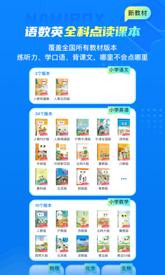2024新课标点读课本已更新! 高清正版,同步课本学习。 包括人教、译林、牛津全国版、北师大、冀教、重大、鲁科等众多版本点读教材,多功能点读课本,让双语学习更简单!让您的手机秒变学习机! 【大招一】- 集点读机、英语复读机、学习机于一体,让手机变身为孩子学习小学英语小学语文的的好帮手,游戏与学习巧妙结合,让孩子爱上小学英语语文课程! 【大招二】- 全国小学课本全覆盖,课本支持中英双语点读、语音测评、课后练习,并有单词默写等多种练习模式多方位助力孩子学习薄弱环节! 【大招三】-正版授权小学英语官方教材,无缝同步小学英语、小学语文课本,让家长放心,孩子省心! 【大招四】-大量优秀的小学英语绘本故事、儿童文学与进口图书,帮孩子开阔课外视野,丰富课余生活! 【大招五】- 小学英语名师视频课,帮助孩子进行自主学习,释放孩子学习效率,提升孩子学习成绩! 【大招六】- 一课一练,小学英语王牌教辅听说练习,让英语孩子再提高! 【大招七】- 包含语、数、外三门学科竞赛小游戏,全国排名,提升孩子小学英语学习兴趣!