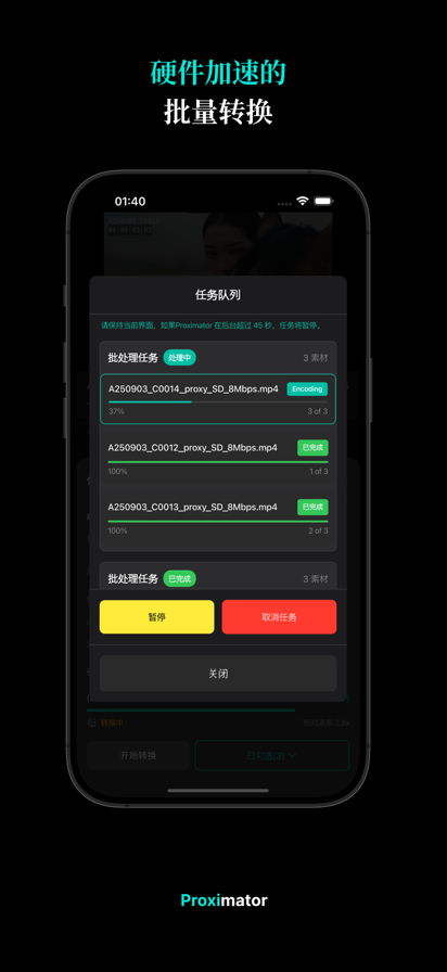 Proximator 将iPhone和iPad 变身为移动代理文件转换工作站,专为视频创作者与影视从业者打造。 插入相机素材卡或外置硬盘,即可预览素材、套用效果,并快速生成体积更小、便于存储与传输的代理素材。 主要功能: • GPU(Metal)加速播放与批量转码 • 实时 3D LUT 预览与带 LUT 输出 • 支持 1.25×–2.0× 变形镜头解压 • 导出静帧至相册 • 文件名、时间码、自定义文字叠加显示 • 低电量保护(3% / 10% / 关闭) • 支持外接读卡器、SSD 与 NAS • 支持 12 种语言界面 • 一次性购买,无需订阅 Proximator 由影视从业者开发,专为需要在外景现场或旅途中即时查看素材、进行代理转码的创作者而设计。