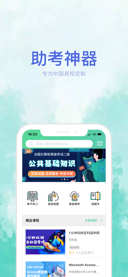 提供适用于各大高校的计算机等级考试、公共英语过级、思想政治基础课程,以及计算机、物理、数学、化学、医学、药学、语言学(英语/日语/韩语/蒙古语/俄语等)、金融、经济、政治等多项专业课程、相关资格证书快速检测通关的在线日常练习、考前刷题及模拟考试训练,并提供来自于专业教师的习题讲解、重点难点解析、考前辅导、过考精讲等精品视频。