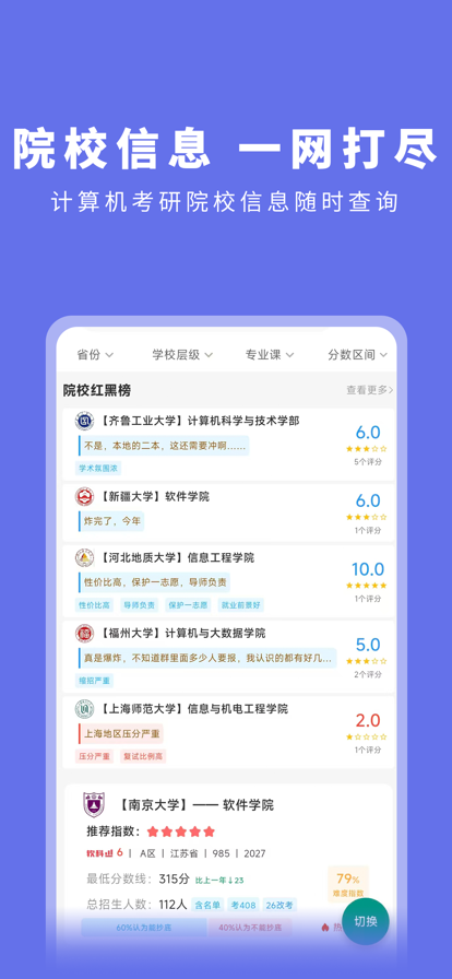【每日打卡】 制定刷题计划,每日打卡刷题。 【考点刷题】 各科分考点,哪块薄弱刷哪块。 【真题模拟】 包含408历年真题,随时随地刷真题。 【错题笔记】 写笔记,增加答题记忆,题友还可以交流笔记。 【考研择校】 包含近500所计算机考研院校招生信息。