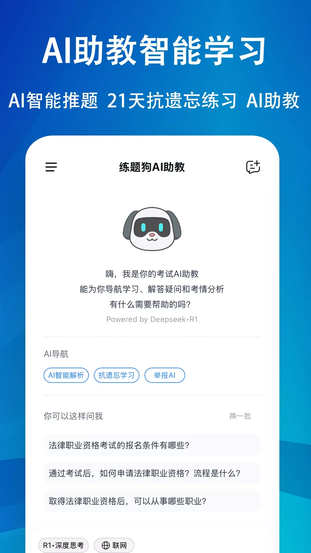 法律职业资格考试备考刷题,题库题目及时更新。 海量题库+AI助教+精准解析,三位一体备战法律职业资格考试~ AI助学焕新上线,章节刷题结合法律职业资格考试大纲,AI智能推题精准定位薄弱环节,结合艾宾浩斯遗忘曲线研发"21天抗遗忘训练",让知识点过目不忘! 法考练题狗备考题库是考生专用的实现科目练习和模拟考试的手机端APP软件,集智能辅导、详细解析、AI解析、全真题库和考试考情于一身,涵盖了章节练习,历年真题,预测试卷,每个科目独立题库,刷题简单,节省复习时间,含有答题解析、错题巩固、统计分析、模拟考试等多功能模块,在复习过程中查漏补缺,提高您的综合分析能力、拓宽知识面。 法律职业资格考试备考王牌APP!愉快的法考备考刷题体验,大家都在用的法考备考掌上助手! 【产品功能】 >>练习: 【章节练习】题库内所有科目的章节练习均可随意练习。 【历年真题】收录近几年法考考试真题,与考试亲密接触。 【易错题目】大数据分析法律职业资格考试易错题目。 【智能组卷】题库随机抽取知识点题目进行组合,随时随地测验自己。 【AI解析拓展】每个题目新增AI解析拓展,帮助您全面了解知识点。 【AI智能推题】个性化推送薄弱知识点+顽固错题+抗遗忘特训题。 【错题巩固】好用的错题巩固功能,清除您备考路上的顽固障碍。 【学习资讯】备考技巧、复习技巧,尽在法考练题狗。 【技术支持】鼎维云课堂 【联系我们】 微博:@练题狗 微信:liantigouapp 客服电话:+8618290463382 (工作日9:00-18:00)