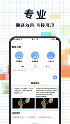 拍照翻译王,可将图片中的语种文字,翻译为想要的语种文字,一键黏贴使用,可通过录音,音频文件,识别后翻译为想要的语种文字,为您提供电子,金融,医疗等专业领域的英文翻译,使用简便快捷,快来下载使用吧!