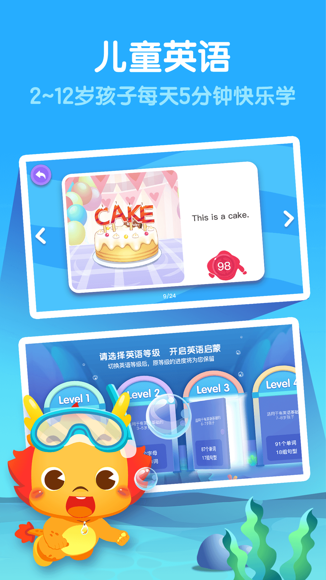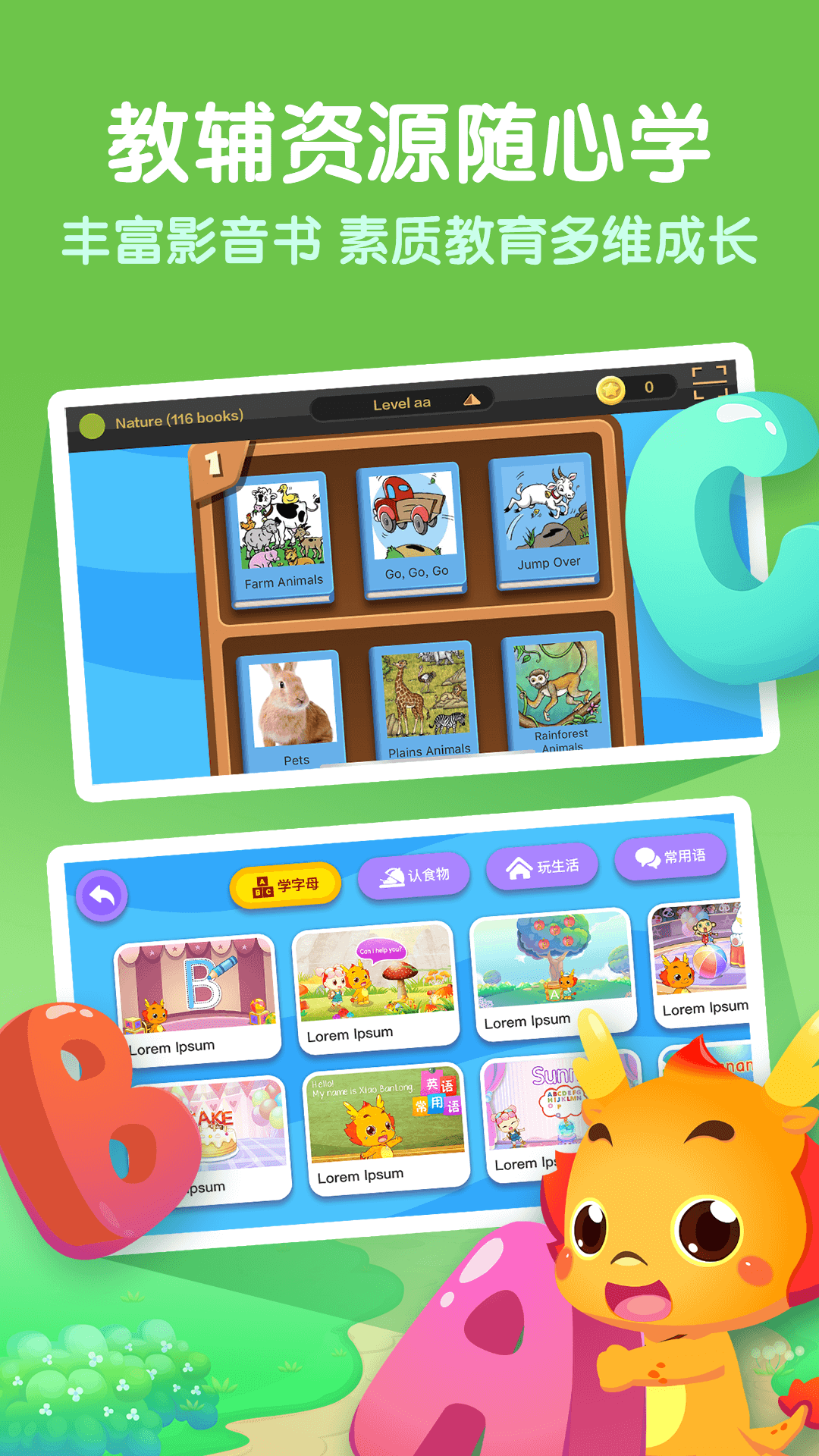 小伴龙ABC——为儿童启蒙打造英语分龄学习平台,对标幼儿阶段英语内容进行英语学习,为孩子提供丰富教辅资源,培养孩子学习英语的兴趣,助力孩子爱上英语。 产品特色 【同步幼小阶段英语内容】 同步幼小阶段英语内容,结合ATM(即时习得英语学习法)、CLT(交际语言法)等标准学习法,通过寓教于乐的英语学习活动培养孩子的学习兴趣,同时激发孩子在听说读写各方面的潜能。 【AI语音评测系统】 地道美式发音,结合AI(人工智能)语音评测将孩子的口语学习可视化,让孩子充满自信开口说。 【丰富配套教辅资源】 卡片式单词学习、双语动画、丰富绘本,全英互动故事,帮助孩子掌握基础单词,在情境中练习英语对话。 【兴趣式启蒙】 打造有趣的学习环节,小伴龙与孩子一起学习探索,让学习英语变成一件好玩的事! 产品内容 今日冒险——系统化幼小英语内容,科学分龄帮助孩子循序渐进学习,AI语音评测让孩子针对练习自信开口。 动画岛——生活情景教学,英语动画给孩子有趣的学习体验。 互动故事岛——好莱坞工作室配音的英语故事,丰富的启发式互动,让孩子在沉浸式环境中成长。