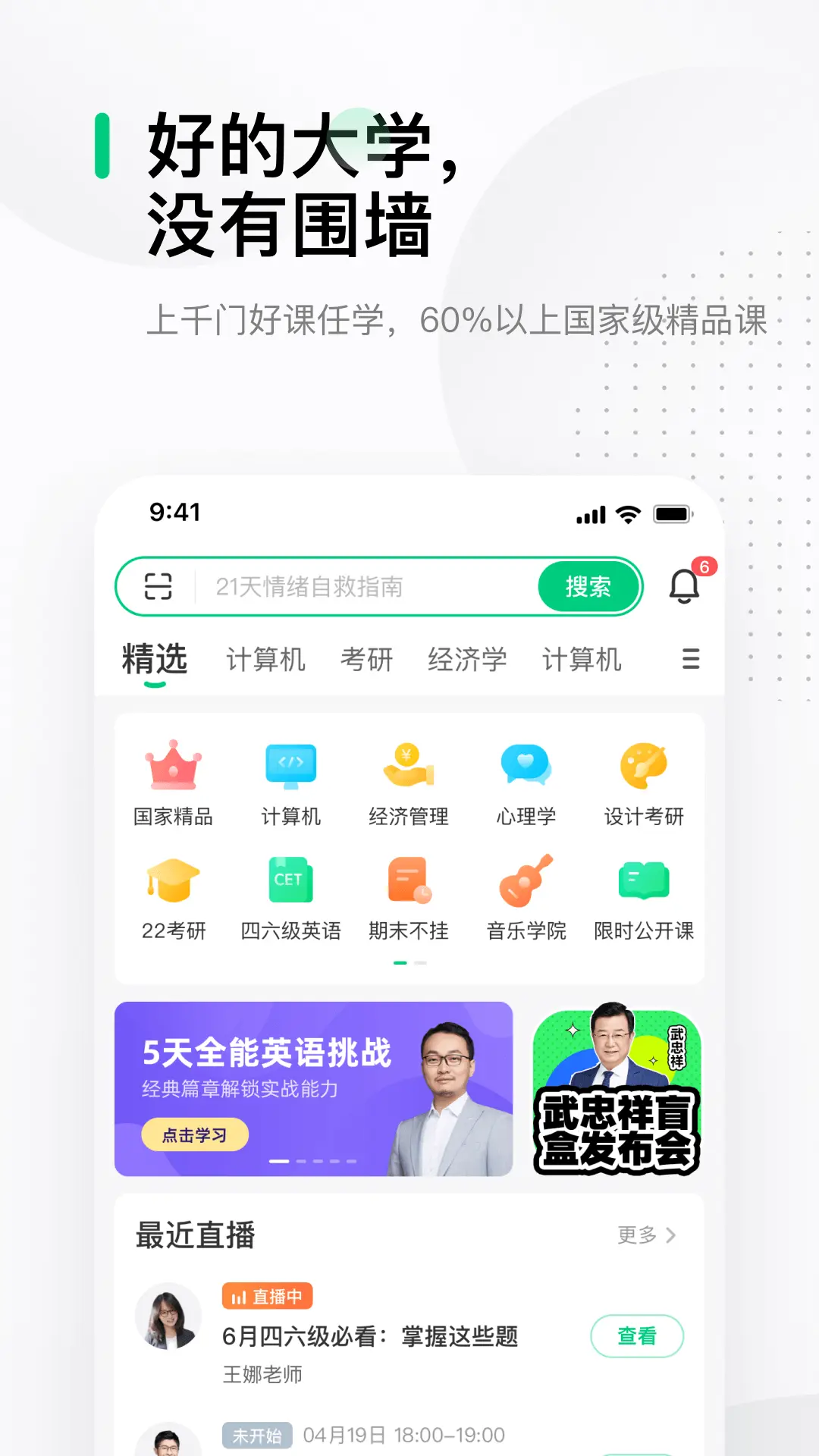 错过心仪的大学,别再错过中国大学慕课! 中国大学MOOC(慕课)是由网易公司与教育部爱课程网携手推出的在线教育平台,汇集中国知名高校的MOOC(慕课)课程。在这里,每一个有意愿提升自己的人都可以免费获得优质的高等教育。 • 丰富的名校名师课程 来自985高校的优质课程,从基础科学到文学艺术、哲学历史到工程技术、经管法学到农林医药,内容应有尽有,完全免费。 • 认证证书 完成课程学习并通过考核,可获得学校和讲师签名证书,。 •优质高效的考研辅导 联合全网最权威最深入的机构出品,精选最好的考研培训专家, 为你提供最优质高效的辅导,同样的时间取得更好的成绩。 • 令人赞叹的教学模式 全新在线教学模式,看视频、做测验、交作业,与同学老师交流互动 ,让学习不再枯燥。 • 贴心的移动学习体验 课件下载与离线观看,第一时间接收课程更新与提醒,随时随地,自主安排学习节奏。 • 入驻名校: 北京大学、浙江大学、复旦大学、西安交通大学 、中山大学、同济大学、武汉大学、中国科技大学、中央财经大学、哈尔滨工业大学...等 • 精彩课程: 《C语言程序设计》、 《金融学》、《数据结构》、《大学英语口语》、《工科数学分析》、《大学英文写作》、《现代礼仪》、《急救常识》、《微观经济学》、《化妆品赏析与应用》、《中国古代建筑史》、《博弈论基础》、《线性代数》、《设计的力量》、《中国哲学史》、《传统文化与中医养生》、《新媒体概论》、《简明世界史》、《文学欣赏与批评》、《大数据算法》...等