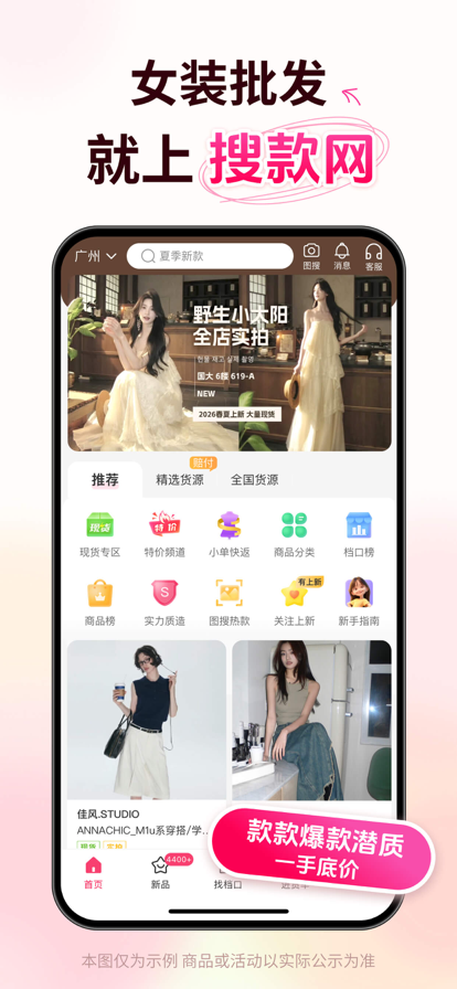搜款网:源头服装批发,一件代发开店神器! 实体店、网店、带货达人首选的服装进货软件。直连工厂一手货源,0囤货、0成本,助力轻松开店。进源头货,卖爆款衣,利润翻倍!款网:源头服装批发,一件代发开店神器! 为什么 600 万服装卖家都在用搜款网? 1. 【源头货源】汇聚全国一级批发市场 深度覆盖广州沙河、十三行、新塘;杭州四季青、四季星座;东莞大朗、潮汕普宁等源头产地。海量女装、男装、童装、鞋包,足不出户掌握全国新款。 2. 【价格透明】厂家直供,告别中间商 直对一级批发商与源头工厂,价格实惠、透明。砍掉层层溢价,帮你压缩 30% 以上拿货成本,直击利润核心。 3. 【一件起批】0 门槛 0 囤货 0 风险 打破传统批发门槛,全站支持一件起批、一件代发。无论是淘宝、拼多多卖家还是直播达人,均可实现“先卖货后下单”,告别压货烦恼。 4. 【极速铺货】1 秒同步各大电商平台 看中新款,5 秒上架!商品图、视频、详情页一键转发至淘宝、天猫、1688、拼多多、抖音、快手、小红书。告别手动传图,运营效率提升 90%。 5. 【省心托管】专业质检,官方代发 你只管卖货,剩下的交给我们!搜款网提供专业跑市场拿货、逐件质检、极速发货及售后退换服务。再也不用起早贪黑挤市场,省时省力做老板。 6. 【趋势风向】每日上新万款,锁定全网爆款 同步更新源头档口最新款式。紧跟韩国东大门、日系、欧美时尚趋势。提供精选优质现货,保障供货稳定性,助你快人一步抢占市场红利。 7. 【全场景覆盖】线上线下生意都能做 无论你是线下实体店主,还是淘宝、抖音、快手、小红书、微店运营者,或是朋友圈创业者,都能在这里找到匹配店铺风格的高品质货源! 【联系我们】您的反馈对我们至关重要。 官网: vvic.com APP: 我的 - 联系客服 公众号/小程序: 搜款网 小红书/抖音/视频号: 搜款网