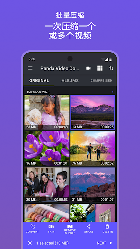 🐼 Panda – 视频压缩软件 & 视频转换器,快速轻松地压缩视频,无可见质量损失!<br><br>💾 释放存储空间<br>视频占用手机存储,让你无法录制新记忆。Panda 压缩视频、调整视频大小、转换视频格式、更改视频编解码器——减小文件大小,而不是删除文件。<br><br>📶 减少流量消耗<br>流量套餐有限?使用 Panda – 视频压缩软件压缩视频,用更少的流量发送文件,帮你和对方节省流量。<br><br>📤 弱信号也能发送<br>弱信号意味着上传文件极慢,甚至失败。使用 Panda – 视频调整工具压缩、调整大小和转换视频来解决这个问题。<br><br>🗂️ 批量视频压缩<br>免费版可同时压缩最多 3 个视频,Premium 版无限量压缩!<br><br>🎥 直接录制并发送<br>Panda 让你在应用内录制视频、压缩文件并发送——一步完成。<br><br>⭐ 功能齐全的视频压缩软件 & 视频转换器<br>● 压缩视频 → 保持 4K 和 HD 画质的同时节省空间<br>● 减小视频大小 → 更改视频尺寸和分辨率<br>● 缩小文件 → GB、MB、KB<br>● 编辑视频 → 剪切、修剪、删除中间段落<br>● 转换视频格式 → MKV 转 MP4、AVI、FLV、RMVB、3GP、MPEG、WebM、WMV、MOV<br>● 更改视频编解码器 → H.264、HEVC(H.265)、VP9 等<br>● 替换视频文件 → 自动用压缩版本替换大文件<br>● 适配邮件 → 缩小视频以适配 Gmail、Outlook、Yahoo 和 AOL<br>● 适配彩信、短信和 SMS<br>● 上传到 Instagram、Facebook、YouTube、Discord 和 TikTok<br>● 通过 WhatsApp、Viber 和 Telegram 发送视频<br>● 为网站或电商页面调整视频大小<br>● 保留视频元数据<br><br>✅ 画质好,文件小<br>压缩视频、调整视频大小、编辑视频、转换视频格式——总有办法在不损失质量的情况下减小视频文件大小、节省存储空间。<br><br>✂️ 修剪和剪切视频<br>不要为无聊的片头浪费流量。剪掉开头和结尾,删除中间部分,去除不需要的片段。只保存和发送你需要的内容。<br><br>📐 更改视频分辨率<br>Panda – 视频调整工具支持一键降低分辨率:640×480、1024×768、1600×1200 等——包括完整的 4K 和 HD。<br><br>🔄 转换视频格式<br>Panda – 视频格式转换器支持以下格式之间的转换:MP4、AVI、MKV、FLV、RMVB、3GP、MPEG、WebM、WMV 和 MOV。<br><br>⚙️ 更改视频编解码器<br>将视频编解码器从 H.264 更改为 H.265、VP9 等。<br><br>📧 适配邮件发送<br>想通过邮件分享视频但文件太大?使用"适配邮件"选项,自动调整为适合 Gmail、Outlook、Yahoo 和 AOL 的大小。<br><br>🏆 高级版<br>● 批量视频压缩 → 一次压缩 3 个以上的视频<br>● 无广告 → 干净、不受打扰的体验<br>● 无推广文字 → 从分享的视频中移除<br>● 邮件支持 → 直接获得团队帮助<br>● 支持我们的开发 → 帮助我们打造更好的工具<br><br>🔒 隐私保护<br>Panda 直接在您的手机上执行所有压缩、调整大小、转换和编辑操作。我们从不查看您的视频,也不会将您的使用数据出售给第三方。
