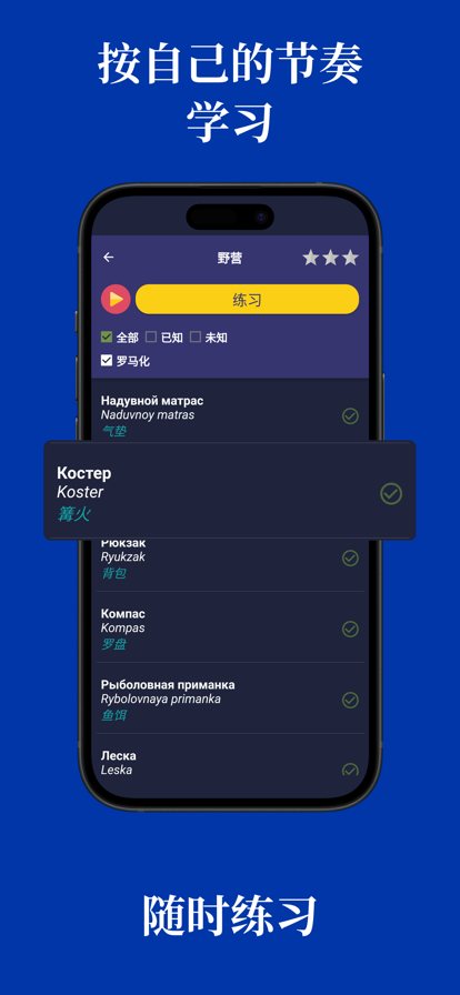 想以简单灵活的方式学习俄语吗? 拥有全球超过3000万次下载量的BNR Languages应用程序,帮助您以实用、简单和独立的方式学习俄语。 完整课程让您可以从零开始,学习字母表,建立词汇量,并通过母语音频录音练习阅读、写作和听力。 独立学习,按照自己的节奏,没有每日限制,并使用复习模式加强您已经学到的所有知识。 非常适合希望快速学习俄语的任何人 — 无论是为了旅行、学习、工作,还是为了与家人和朋友更好地交流。 发现为什么我们的应用程序是随时随地学习的理想选择: - 离线俄语课程 — 从初学者到高级水平。 - 独立学习,按照自己的节奏,无需老师。 - 没有时间限制或每日活动限制。 - 通过带有图片的互动练习使学习更轻松。 - 复习模式以练习和复习内容。 - 可调节播放速度的母语音频录音。 - 不同类型的练习:阅读、写作和听力。 - 直观且适合各年龄段的易用界面。 - 参加每周排名并与其他用户竞争。 - 该应用程序完全离线运行 — 无需互联网连接。 - 所有内容都免费提供。 立即下载并开始以简单、实用和灵活的方式学习俄语 — 按照您自己的节奏! Terms of use: https://www.apple.com/legal/internet-services/itunes/dev/stdeula/