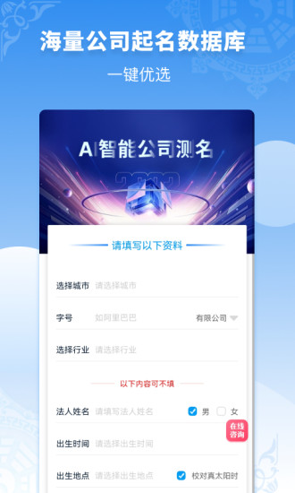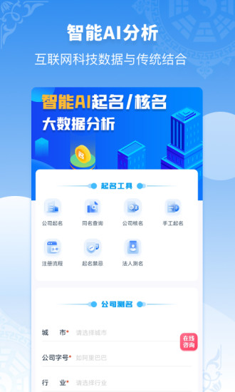 一个让人过目不忘的公司名字是迈向成功的基石,一个好的公司名称可以更加契合业务让业绩蹭蹭张,更是公司财富的源泉,昭示着灿烂辉煌的前景。公司起名同名查询助手,一款帮您免费起公司名字,免费公司同名核名,公司名字分析工具。 【专业公司起名】 通过多年研发的汉字自然语言名称分析算法结合全国千万公司名称库,2000万全国商标名录,数百万诗词典故数据,生成海量的名字任你选择.AI智能公司起名,基于名字大数据AI智能分析起名,AI智能公司起名字是用全国8000万公司名字数据,通过AI智能分析名字频率,结合行业特色,城市地区、法人生辰日期,易学卦象,来进行传统起名与现代科学起名相结合的只能智能起名算法。 【一站式起名服务】 不用担心公司同名,不用幸苦查阅字典起名字,公司起名同名查询助手拥有公司同名查询,公司名字分析等所有功能。可以通过按照城市、行业、名称风格、意蕴风格、限定字筛选起公司名字、商铺名字。也可以根据汉字笔划分析、字形分析、字义分析、音韵分析、音调分析、诗词寓意分析、名称相似分析、品牌相似分析、法人姓名、生日分析、行业特点分析取号公司名。 可手工定制适合自己的专属公司名,一对一老师全程沟通