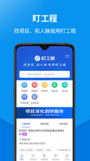 找项目、拓人脉 就用盯工程!盯工程——建筑行业商机服务平台,助力企业高效拓展项目与人脉! 【核心功能】 全国工程项目信息:覆盖95%以上的新建、在建项目,提供立项、设计、施工、分包等全阶段信息,助您快速锁定商机。 精准人脉资源:整合16万家活跃总包企业资源,一键查询关键联系人,轻松梳理项目攻关路径。 招标中标数据:依托亿级数据库,实时更新招标采购信息,助您抢占市场先机。 轻量化项目管理:一键拨号、一键报备、一键保存通讯录,提升项目转化率与团队协作效率。 【客户价值】 抢项目商机:10秒筛选优质项目,多维度分析甲方实力,提升项目赢单率。 梳理人脉路径:一键关联目标客户背景数据库,快速找到最优攻关路径。 高效管理:整合项目信息系统,实时跟进项目进度,提升团队协作效率。 【为什么选择盯工程?】 数据精准:200+专业调研团队人工核实,确保信息真实可靠。 覆盖广泛:全国31个省市工程项目信息,24小时持续更新。 行业领先:建筑行业大数据平台标准主编单位,服务超100万行业用户。 立即下载盯工程,开启您的建筑行业商机之旅!