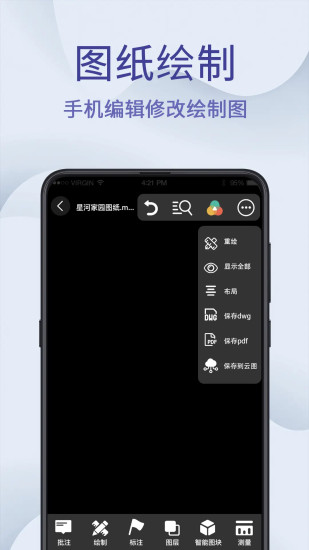 同事发的图纸看不了?客户想看设计图没有带电脑?只能查看图纸无法批注沟通?这是一款CAD图纸、批注图纸、分享图纸、沟通图纸、管理图纸的CAD看图制图软件。让你再手机上就可以进行CAD看图、CAD制图、图纸批注(CAD批注)、图纸沟通等技术交流,是一款手机cad看图制图软件。 这是一款看图纸CAD看图软件,提供DWG格式的文件图纸查看、图纸编辑、CAD看图、CAD制图、手机cad快速看图、CAD测绘等功能,同时可进行图纸分享、上传云图,一部手机即可实现图纸的沟通、协作,提高办公效率。 1. CAD手机看图,便捷高效 CAD图纸的支持直接打开微信、QQ里接收的图纸文件,极速浏览AutoCAD和各类建筑、工程、装修、园林等CAD图纸,全面兼容。真矢量CAD图纸显示,云字体提供CAD字库,手机上即可完美显示图纸,手机上实现CAD看图、CAD快速看图。 2. CAD批注,一键分享上传 支持语音、照片、文字、箭头、图形等多种方式对图纸进行批注,基于图纸进行专业技术沟通,支持一键分享图纸给同事,或上传云图保存,提高了工作效率。 3. 图纸分类管理 针对不同来源的CAD图纸进行分类管理,并可通过文件名一键搜索图纸、查找图纸,手机上查看CAD图纸更便捷。 4. CAD制图 手机上也可实现CAD制图、绘图,在手机上新建CAD图纸,进行CAD图纸的绘制、测量、批注、文字查找等功能,还有正交绘制实现直线绘制、矩形绘制的功能。