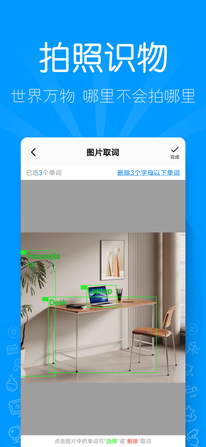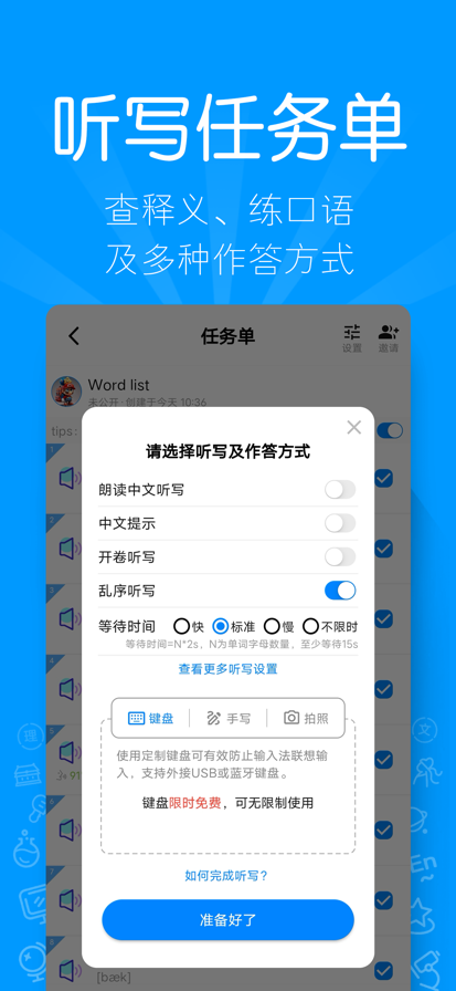 福利来啦~ 老师给孩子布置的听写作业,没时间、不会读,怎么办? 用AI听写,拍照取词、标准发音、自动批改,您的学习好帮手! 再也不用麻烦父母啦,自己搞定so easy~ 功能简介 1. 支持英语和汉语词汇AI听写; 2. 拍照取词:单词表、短语和中文词汇秒识别,还能支持物体识别,哪里不会拍哪里! 3. 听写任务单:自由添加词组,查释义、练口语,支持朗读中文、乱序、开卷等多种听写方式; 4. 键盘作答:使用定制软键盘输入,可有效防止输入法联想识别,并且支持外接USB或蓝牙键盘,提升学习效率; 5. 手写作答:好记性不如烂笔头,在屏幕上手写输入,支持触控笔或连接智能笔作答,加深书写记忆; 6. 拍照作答:脱离电子设备,可以在纸上书写听到的答案,作答完成后拍照上传AI批改,用最传统的方式脱离外界干扰; 7. 作答统计:与好友一起完成任务单,查看作答分享、排名统计和单词正确率,邀请搭子一起来听写吧! 8. 收藏及错题本:任务单听写错误单词自动收录进错题本,对不熟悉的单词也可以主动收录,方便梳理和复习。 9. 同步教材:实时同步更新小学到高中全国各地教材版本的单词表,轻轻一点,即刻开始!