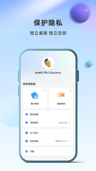 你的另一台私密手机 还在怕你的隐私暴露吗,来隐形空间体验你的另一台私密手机,接近安卓真机的体验,你可以这这台手机内下载使用其他应用,同时我们还能伪装成其它应用,即使放在桌面上你的隐私也不怕泄露。同时在我们手机内下载的应用不占用你的真机存储,数据保存在云端,既保护了你的隐私,又保证了你的安全。 另一台私密手机 独立运行的安卓系统,灵活使用各类软件。 数据云安全 数据云化,防泄露,防丢失,帮助您加密隐私。 隐私加强 您可以将应用伪装成计算器或浏览器,以保护您的秘密不被发现。 释放本地资源 应用不占用本地存储,提供稳定、安全的数据存储服务。 应用多开 应用多开,独立运行,完美的使用体验