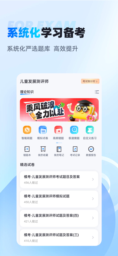 儿童发展测评师考试聚题库——专业备考 精准训练 助力儿童发展评估能力提升 备战儿童发展测评师资格认证考试?儿童发展测评师考试聚题库是您专业可靠的备考助手。我们提供权威精准的练习资源,助您系统掌握儿童发展评估专业知识与技能,从容应对考试挑战。 真题模拟实战演练 应用内精选汇集历年考试真题及高质量模拟试卷,严格依据最新考试大纲与命题规律精心编写。通过模拟考试功能,您可体验真实考场环境,进行全真限时测试。考试结束后,系统即时生成详细分析报告,清晰展示您在儿童发展理论、评估方法、测评工具使用、报告撰写等各模块的掌握情况。智能评估系统精准定位知识薄弱环节,帮助您明确复习重点和改进方向。 系统化知识点练习 我们依据考试要求将知识点科学分类,涵盖儿童发展基本理论、各年龄段发展特点、发展评估方法、常用测评工具使用、评估报告撰写、特殊需求儿童评估、家庭教育指导、相关法律法规等核心内容。每个知识点模块都配有专项练习题和详细解析,帮助您深入理解儿童发展评估专业知识。您可以根据学习进度选择对应章节练习,巩固理论基础,掌握重点难点。 儿童发展测评师考试聚题库集权威真题模拟与系统知识点练习于一体,设计科学,操作便捷。通过反复的实战演练和针对性训练,帮助您夯实专业基础,提升评估实践能力。应用内容持续更新,紧跟行业规范和考试要求,是您备考复习、查漏补缺、提升通过率的专业工具。立即下载应用,开启高效备考之旅,为儿童发展测评师职业发展奠定坚实基础。