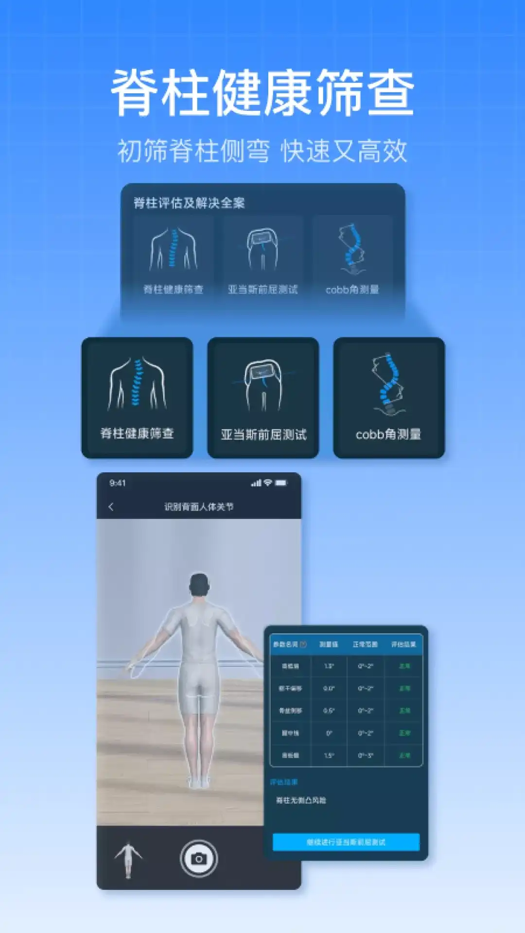 【基于维萨里3D人体模型研发的AI体态评估软件】 维萨里体态评估大师APP提供:全身体态评估,颈部评估,肩部评估,胸腰椎评估,脊柱侧凸筛查,亚当斯前屈测试,cobb角测量等身体评估,身体成分评估等功能.维萨里AI算法自动分析,快速得出结果!产品适用于:康复医生,瑜伽普拉提教练,正骨推拿师,体态管理师,健身教练,普通健身爱好者.该软件轻松易上手,快速提高康复师体态筛查效率,帮助普通人发现体态健康风险,呵护您的健康! #体态评估经常遇到的问题 ●手动画线作评估流程复杂,容易产生误差. ●手动评估和测量体态需要花费大量时间,效率差; ●手动测量和评估的结果难以系统地记录和存储; ●手动评估结果难储存,容易丢失,不便于分享; 一、维萨里体态评估大师核心亮点 1、提供评估用户管理系统,方便对评估记录搜索,查找,分享; 2、支持评估报告一键导出,提供图片格式,PDF格式报告; 3、提供前后评估效果对比,对康复效果进行准确评估; 4、支持隐私遮挡,照片背景清除,保护评估者隐私信息; 5、评估效率高,提交数据后快速生成评估结果; 6、使用手机重力场识别功能,支持脊柱亚当斯前屈测试; 7、拍摄脊柱清晰的脊柱X光照片,3-10秒生成COBB角分析报告; 8、一个账户支持3个终端同时登录,适合康复工作室集体协作; 产品运营合作:15818210111 (同微信) 技术服务支持:18109282265 (同微信)