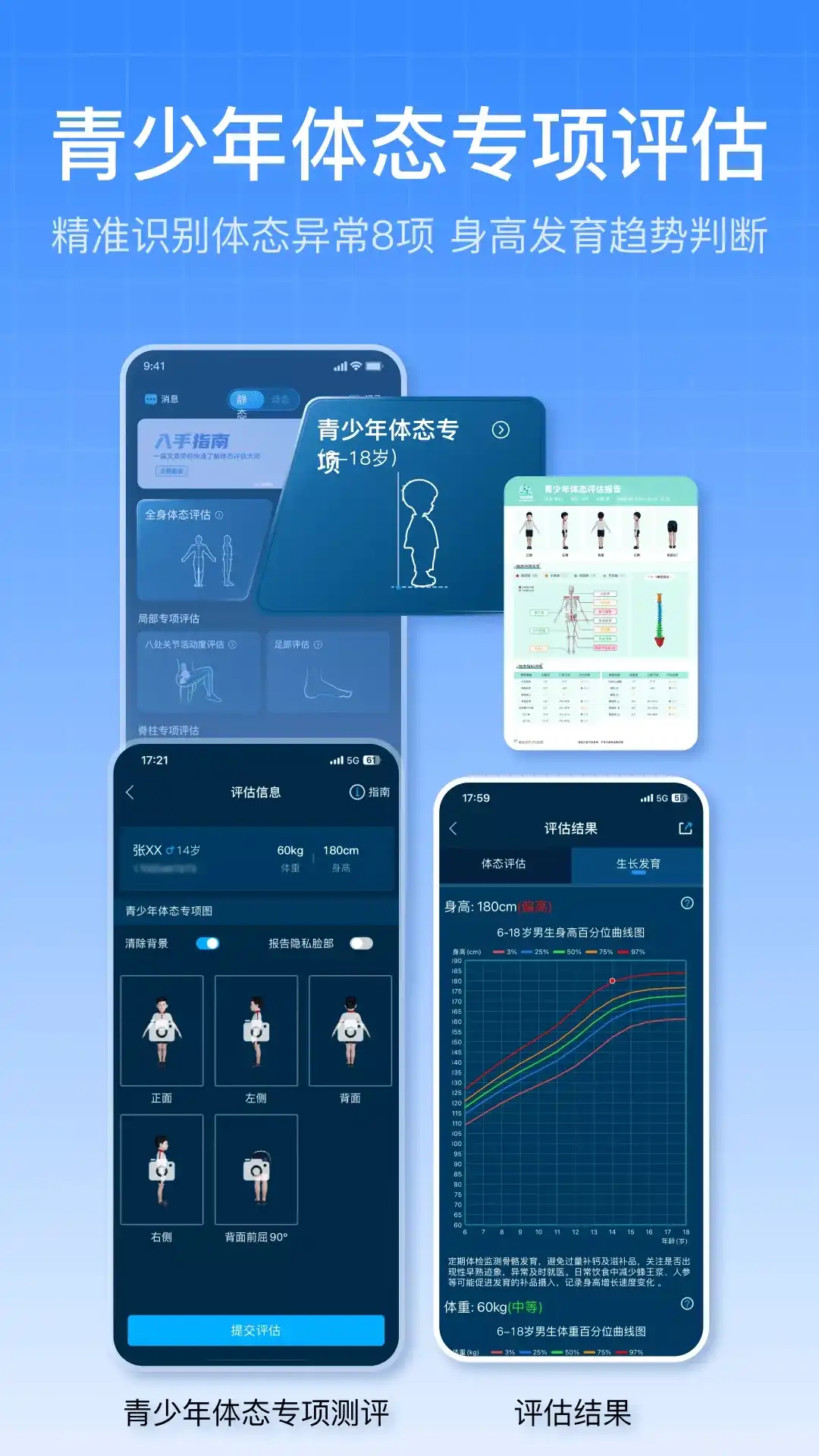能够在手机上进行体姿测评,拍摄完正视图、侧视图和背视图以后就能提交了,会根据图片进行智能测评,纠正错误姿势,帮助用户养成良好的体态,不管是站姿还是坐姿都能得到改善。 办公室久坐导致颈椎疼?低头看电脑导致头前伸?不良生活习惯导致各种体姿体态问题?溜肩驼背,斜方肌,脊柱侧弯、O型腿等等,你的骨骼已经在哀嚎,你却还没有意识到!你需要一个贴身的身体管家。 了解体姿体态健康,体资体态测评来帮你。基于先进的AI人工智能及大数据分析智能测评技术,只需三个照片,即可获得你的体姿报告。让你对自己的身体状态了如指掌,从容应对各种挑战。