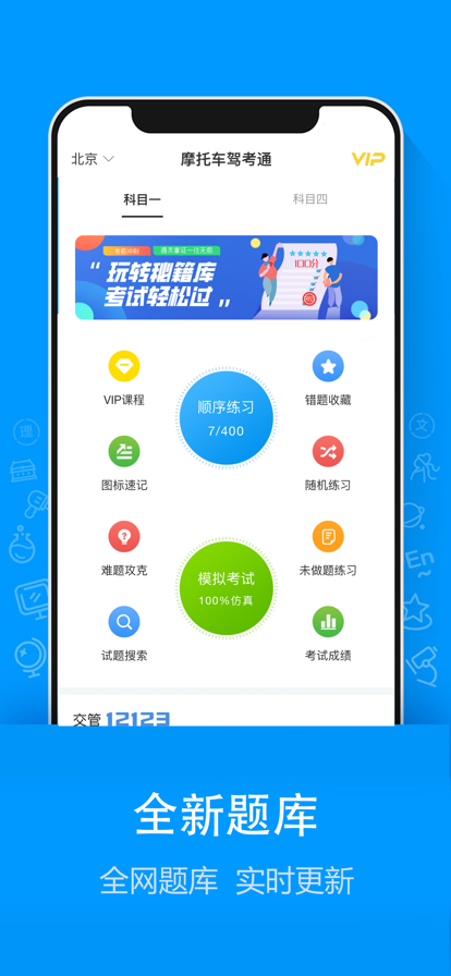 ~数百万摩托车驾考学员正在使用的科一/科四题库 刷题利器~ ~摩托车驾照考试就用摩托车驾考通~ 【全新题库】全网题库 实时更新。 【多种做题模式】提供多种做题模式,答题模式、背题模式、顺序练习、随机练习。 【智能数据统计】自动记录做题次数,答题正确率,做题进度,让练习更省心。 【错题收藏笔记】系统自动记录用户错题、用户主动收藏经典题目,记录笔记,还可以针对性生成练习。 【专项练习】章节分类,题型分类,难度分类,针对强化,轻松突破。 【离线题库】刷题不用联网,练题不受拘束!