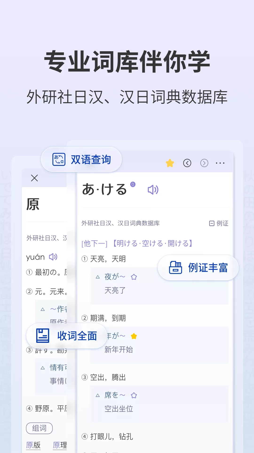 与其他日语学习软件相比,本应用具有五大特色: ①外研社携手海笛出品,著名品牌有品质保障; ②以外研社日汉汉日词典数据库为基础; ③与日语教学相结合:《你好!日语》系列、《新日语会话商务篇》、《新大学日语四级全真模拟试题》等; ④可查单词、查日语例句,还能背单词、练口语等; ⑤特邀教师录制视频课程,讲解日本财务知识与职场常识等。 想要学习或正在学习日语的你或许也有这样的困扰: 单词记不住,外来语总是学不懂; 发音不标准,不敢开口说日语; 日语课程资源虽不少但很杂乱,自学没有方向,无法系统地进行学习...... 现在,日语 爱好者的福音来啦! 唯一官方正版《大家的日语》丛书系列App,由外研社携手海笛针对中国日语学习者特别设计,帮初学者入门、帮爱好者拓展、帮从业者进阶,“大家的日语”让大家都能学好日语! ★★★ 内容特色 ★★★ 【日语教材配套资源】 全新开设学习栏目,新增《你好!日语》系列、《日语会话基础篇》、《新日语会话商务篇》、《新大学日语四级全真模拟试题》配套免费音频资源。 【依托权威专业词库】 本应用所收录的词汇来自外研社日汉汉日词典数据库,由专业人士整理审校,聚合积累多年的日语词典数据资源。 【收词全面领域广泛】 本应用词库规模宏大,优选各级各类约20万词目; 以语文学科为主、兼顾百科,涉及多个学科领域。 【释义简洁例证地道】 本应用提供全面详细的词汇义项、例证,力求将每个词条都解析透彻,在答疑解惑的同时,让你有效提升词汇量。 【原汁原味地道发音】 单词、例句提供发音,让你感受原汁原味的日语、学会地道口语。 【五十音图轻松入门】 专为日语初学者精心设计五十音图卡片,包含日语假名的发音、书写、罗马音表记方式等,同时配套高校日语专业教授精讲视频,手把手教会日语五十音的写法和声调。 【口语达人专注强化】 --收录当下都市年轻人关注的8个主题、55个热门话题。 --情景式设计,分场景提供日语发音练习素材,让你身临其境地感受日语思维方式、学习日语口语表达。 【日本和歌文化拓展】 精选日本经典的和歌集,加入语法讲解、作者简介、和歌鉴赏栏目,让你轻松理解日本传统文化。 【独家专项视频课程】 独家特邀教师真人出镜,录制《日式簿记基础教程》和《日本商务礼仪》两大系列视频教程,详细讲解日本财务基础知识、日本职场常识与礼仪、日式沟通技巧等,助力日语职场人提升职业素养。 ★★★ 功能特色 ★★★ 【智能查阅】 支持模糊查询,即使输入不完整单词,也可即时查到智能匹配的词条、短语、例句等。 多维度智能候选词,查词更快更便捷。 【双向查词】 忘记单词怎么办?不知如何用日语表达?只需输入中文意思也可以查到单词。 日汉、汉日双向查词服务,融入智能联想技术,一站式查遍词目、短语、例句。 【单词背诵】 个性化定制背诵计划,AI根据艾宾浩斯记忆曲线智能提醒复习,轻松记住单词。 各类考试词汇一应俱全,轻松突破:高考日语/大学日语四级/大学日语六级/日语考研/专四/专八/JLPT等。 【通知栏快捷查词】 学习时不方便打开词典查词?打开通知栏快捷查词功能,即可轻松查询生词。 【学习记录云端存储】 在本地和云端同步存储学习记录,包括学习计划、学习进度、个人收藏等,再也不用担心学习进度丢失。 由海笛携手外研社官方正版发布,外研社大家的日语App集查单词和学日语于一体,提供方便快捷的查词服务和实用强大的学习服务,逐个击破日语学习难点,让你事半功倍地学好日语。 选择正版应用,学习更有保障!(版权所有,盗版必究)