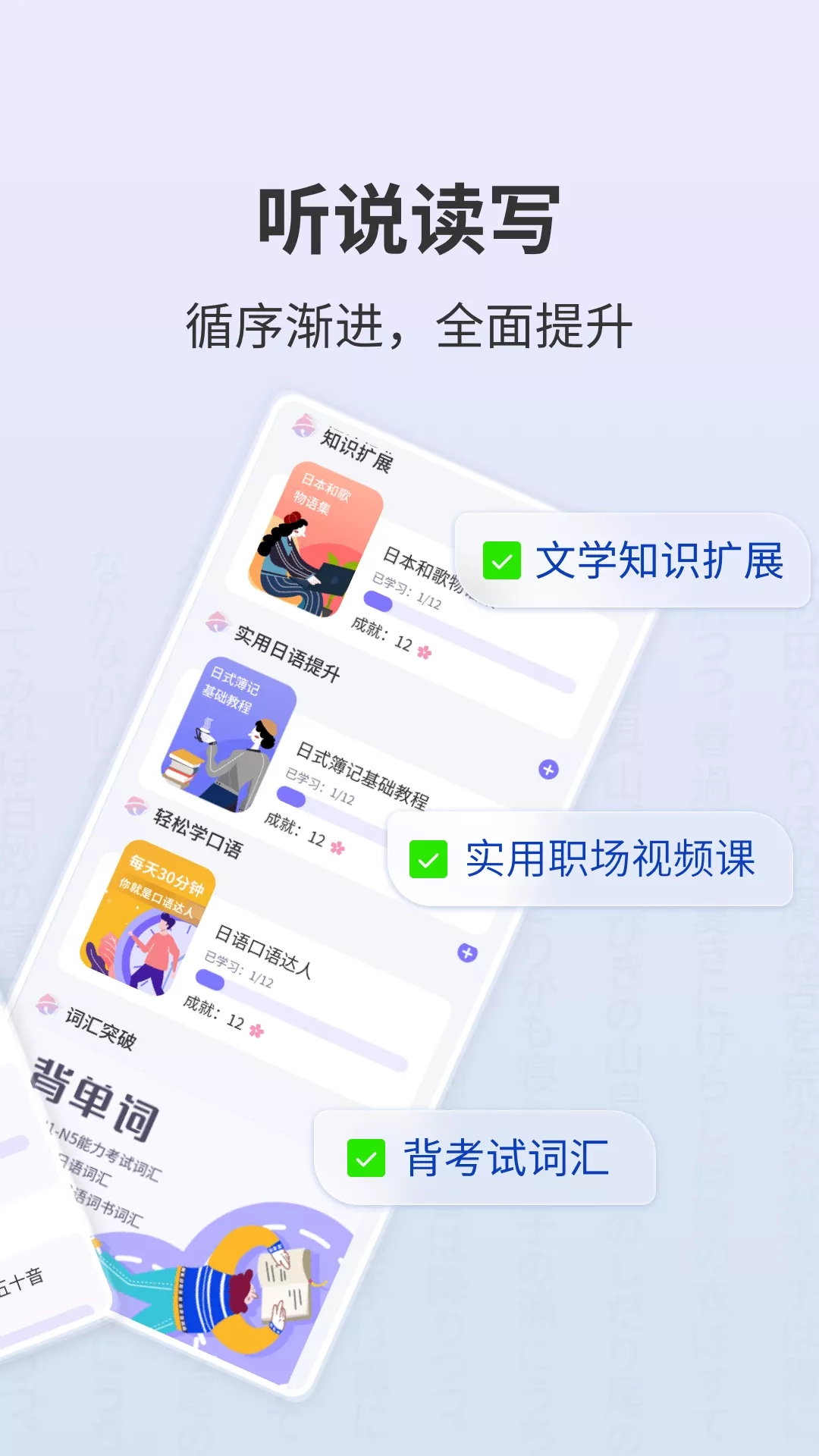 为日语学习爱好者量身打造的学习软件。五十音图、单词、语法、对话……步步进阶,轻松入门学日语。 【功能介绍】 ●边读边写 五十音图 录音跟读,手写笔画,发音技巧。打好五十音基础,才能熟练的使用日语输入法,在接下来的学习中会事半功倍。 ●兴趣闯关 应有尽有 《海贼王》、《夏目友人帐》、《龙猫》、《情书》、《求婚大作战》、《深夜食堂》……无论动漫、电影还是日剧,搜罗经典和流行,闯关形式使学习更有动力,寓教于乐。 ●完备词库 科学背词 新标日、新编日语、能力考等各类词库一应俱全。全新的背词模式,科学高效。 ●名师好课 快速入门 日漫物语、好听好玩的歌曲教学、7分钟词汇记忆法……兴趣小课堂,轻松掌握知识点。 ●高级进阶 考试助力 48天零基础至N5,专业课程,专享服务,随时随地跟着名师学日语 。 【使用交流】 ●您在使用中如遇到问题,可通过“常用问题与反馈”和我们联系,我们将竭诚为您服务。 ●有产品建议?想学习的歌曲?想了解的动漫?欢迎留言,我们会努力改进!