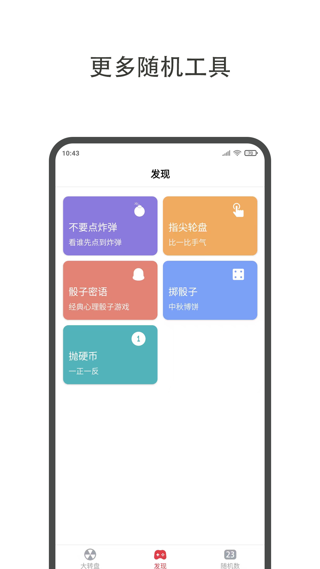 大转盘小决定是一款实用的转盘及随机工具应用,能快速帮你做决定做选择。当你在ABCD中徘徊不知道如何选择时,不妨将你纠结的选项输入到转盘中,让转盘来帮你做选择。 晚上吃什么?谁来做家务?如何惩罚男朋友?真心话大冒险?都能玩。同时,本软件还有随机数、抛硬币、掷骰子、指尖轮盘等多种随机工具,能让你更轻松的做决定。 本软件采用随机算法生成结果,一切随缘,赶快来下载体验吧。 特性: 1、转盘支持自动和手动滚动两种模式 2、内置多款转盘配色 3、随机数 4、掷骰子 5、指尖轮盘 6、不要点炸弹 7、抛硬币