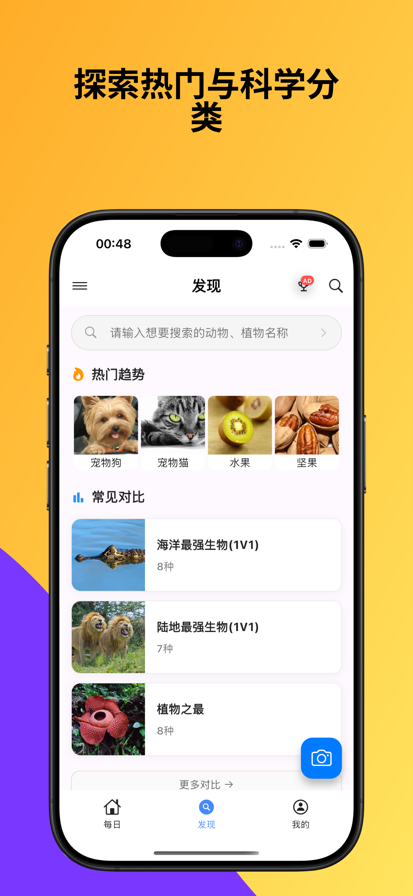 动植物大全 —— 全面的动植物百科与智能识别应用 动植物大全是一款围绕自然知识学习、动植物识别、生态科普打造的专业级应用。应用融合先进的图像识别技术与全面的动植物百科数据库,旨在帮助用户随时随地了解身边的自然世界。无论你是学生、教师、自然爱好者、户外旅行者,还是对动植物充满好奇的普通用户,都可以通过这款应用快速识别未知物种、学习科普信息、建立个人收藏,并持续获取每日自然知识。 动植物大全以简洁专业的交互设计、丰富系统的百科数据、多场景适用性为核心优势,为广大用户提供可靠且易于使用的自然工具型应用。 一、智能拍照识别:即时了解身边的自然 应用采用先进的图像分析和特征识别模型,通过拍照即可快速识别动植物及真菌,识别准确度高,响应速度快。 支持识别的物种类别包括: 常见和稀有的植物品种(花卉、乔木、草本植物、盆栽植物、果蔬、药用植物等) 多类动物(哺乳动物、鸟类、爬行动物、两栖动物、鱼类等) 昆虫及其他节肢动物(蝴蝶、蜜蜂、甲虫、飞蛾等) 真菌与蘑菇(可食用菌、野生菌、毒蘑菇等) 用户只需拍摄或上传照片,应用即可自动分析其形态特征并给出识别结果。在户外旅行、校园学习、园艺种植或日常生活中遇到陌生植物或动物时,都能随时获得准确的信息。 二、系统化动植物百科:内容全面、结构清晰 动植物大全内置的大型自然百科数据库覆盖数万物种,信息来源可靠、分类科学,适用于从初学者到专业爱好者的不同需求。 百科内容包括: 物种名称、学名、拼音 科属分类、形态特征 生长或生存环境 分布区域、季节变化 行为习性、食性、保护等级(适用于动物) 药用价值、观赏价值、经济用途(适用于植物) 安全提示或毒性说明(适用于动物与真菌) 所有百科页面均进行了结构化编排,便于查阅与学习,让用户不仅能够识别物种,还能深入了解其特性与背景知识。 三、拼音标注功能:更适合学习与教育场景 在识别结果与百科页面中,应用支持以拼音形式展示物种名称,方便用户正确发音或记忆。不论是学生进行自然科普学习、家长进行亲子辅导,还是初学者认识物种名称,这一功能都能提供显著的学习帮助。 该功能适用于中文学习者以及自然教育相关使用场景,使得知识获取更为直观。 四、智能搜索:快速定位目标物种 除了拍照识别,应用还支持通过输入关键词进行检索。无论是输入物种中文名称、部分特征描述,还是常见类别名,应用都能迅速匹配最相关的结果。 例如: 输入“熊猫”“朱鹮”等知名动物即可获得百科资料 输入“可食用蘑菇”即可查看相关真菌信息 输入“落叶乔木”可找到对应的植物分类 输入“世界最大的猫科动物”等描述性词语也可得到结果 智能搜索的目的在于让用户无需拍照也能完成物种查询,提高使用灵活性。 五、收藏与记录:构建个人自然图鉴 用户可以将识别结果或感兴趣的物种添加到收藏夹,系统支持对收藏内容进行分类管理,帮助用户构建个人的自然图鉴。 收藏功能在以下场景中尤为实用: 户外探索时记录沿途遇到的物种 为学校自然课程准备学习资料 园艺爱好者整理植物信息 自然摄影爱好者记录拍摄对象 科普讲解员或教师构建示例库 通过收藏系统,用户可以回顾学习成果,也能持续积累自己对自然世界的观察。 六、每日动植物推荐:持续扩展自然知识 动植物大全每天都会向用户推荐一类精选物种。推荐内容涵盖植物、动物、昆虫、真菌等多种类型,通过简洁易读的介绍帮助用户了解新知识,拓宽视野。 每日推荐适合作为轻量化学习内容,也适合长期积累自然科普知识的用户。 七、专题合集:深入了解自然世界的多样性 为增强自然学习的趣味性,应用定期推出主题性的物种合集,内容包括: 世界动物之最(最大、最小、最快、最重等) 全球各类毒性生物介绍 老虎品种与各地区大型猫科动物分析 世界各国特色代表性物种 恐龙及史前生物相关科普专题 特殊植物专题,如食虫植物、寄生植物、巨型植物等 专题内容以科普为主,力求为用户呈现自然界的多维度知识体系,让学习更加系统化且富有趣味。 八、适用人群与使用场景 动植物大全适用于多种场景与用户类型: 1. 教育场景 学生、教师、培训机构可以将应用作为自然科学辅助工具,在课堂、实验、户外教学中使用。 2. 家庭场景 家长可与孩子共同识别物种,培养观察力与科学兴趣。 3. 户外场景 登山、徒步、露营、园艺、野外探险等活动中,可快速识别遇到的动植物,提高安全性与趣味性。 4. 专业场景 科普讲解员、自然摄影师、博物馆工作人员、植物园管理人员等,也能将应用作为辅助查询工具。 九、为什么选择动植物大全 覆盖面广:包含大量植物、动物、昆虫与真菌数据 识别准确:依托先进模型进行图像判别 使用便捷:界面清晰、操作简单 学习友好:结构化知识呈现、更自主的学习方式 持续更新:数据库与功能会不断拓展和完善 适配性强:满足学习、研究、兴趣、户外等多重需求 十、隐私保护与使用条款 动植物大全高度重视用户隐私,严格遵守相关法规和平台规范,不会将用户的照片与数据用于未经授权的用途。 使用条款参考 Apple 标准协议,详情可查阅: https://www.apple.com/legal/internet-services/itunes/dev/stdeula/