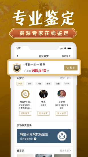 【关于域鉴】 快乐收藏,轻松入行!域鉴APP是一款旨在打破收藏行业的壁垒,为广大古玩爱好者提供的在线学习古玩知识,交流古玩的收藏垂直平台,同时可以帮助拥有各类藏品的收藏爱好者提供低门槛快速鉴赏渠道,并提供3天无理由退货保障的民间藏品交易平台 【功能介绍】 -----专家鉴赏----- 百位知名古玩收藏专家实时掌眼,藏品新老,收藏难题,一键解答 -----藏 宝 阁----- 集中展示古玩真品与专家点评,助力藏友提升\\\\\\\“眼力\\\\\\\“ -----古玩拍卖----- 先鉴赏再上拍,藏品经专家鉴赏为真品后,该藏品可申请拍卖,平台保障,拍下后一律支持3天无理由退货 -----域鉴直播----- 古玩达人,行业大咖直播互动,全方位展示藏品细节 ----域鉴优品---- 珍惜藏品,专家精选,24小时不间断的拍卖专场 ----特色保真模式---- 古玩交易不吃药,卖家将藏品寄往域鉴鉴赏中心,由专家团实物联合鉴赏,真品方能成交 ----古玩学馆--- 知名专家视频授课,古玩鉴赏实战教学,古玩门槛不再\\\\\\\“高不可攀” 【联系方式】 官方客服:400-189-3520 保障买卖双方合法权益 微信公众号:域鉴-微信小程序同步对接app 新浪微博:域鉴APP-域鉴新鲜事,每日发布 今日头条:域鉴-古玩知识,视频每日分享 百度贴吧:域鉴吧-问题反馈,聊天灌水